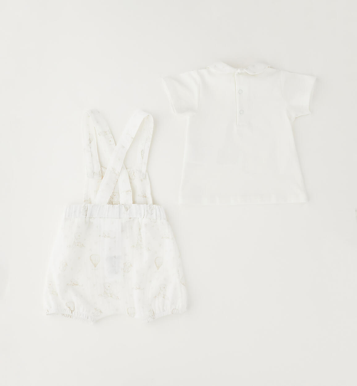 Minibanda unisex short-sleeved baby set. Stretch cotton jersey T-shirt with snap-button back. Muslin overalls with an all-over pattern and adjustable straps. By choosing our cotton products, you support Minibanda's commitment to the Better Cotton mission. This product is supplied through a mass balance system and may not contain Better Cotton. Learn more at bettercotton.org/massbalanceComposition