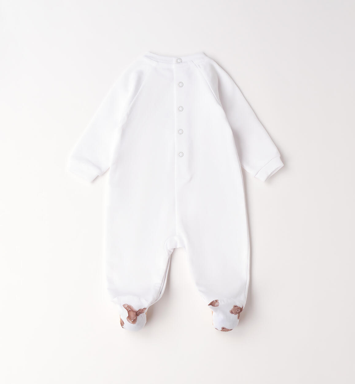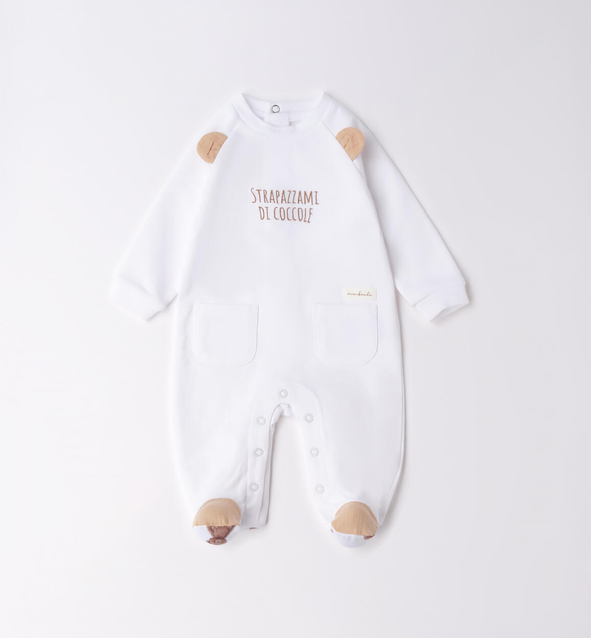 Minibanda footed onesie for newborns made of 100% cotton fleece. It features front pockets and embroidery. It features cute ears and feet in a contrasting color. The opening at the back and inside the leg makes changing and dressing easier. By choosing our cotton products, you support Minibanda's commitment to the Better Cotton mission. This product is supplied through a mass balance system and may not contain Better Cotton. Learn more at bettercotton.org/massbalance
