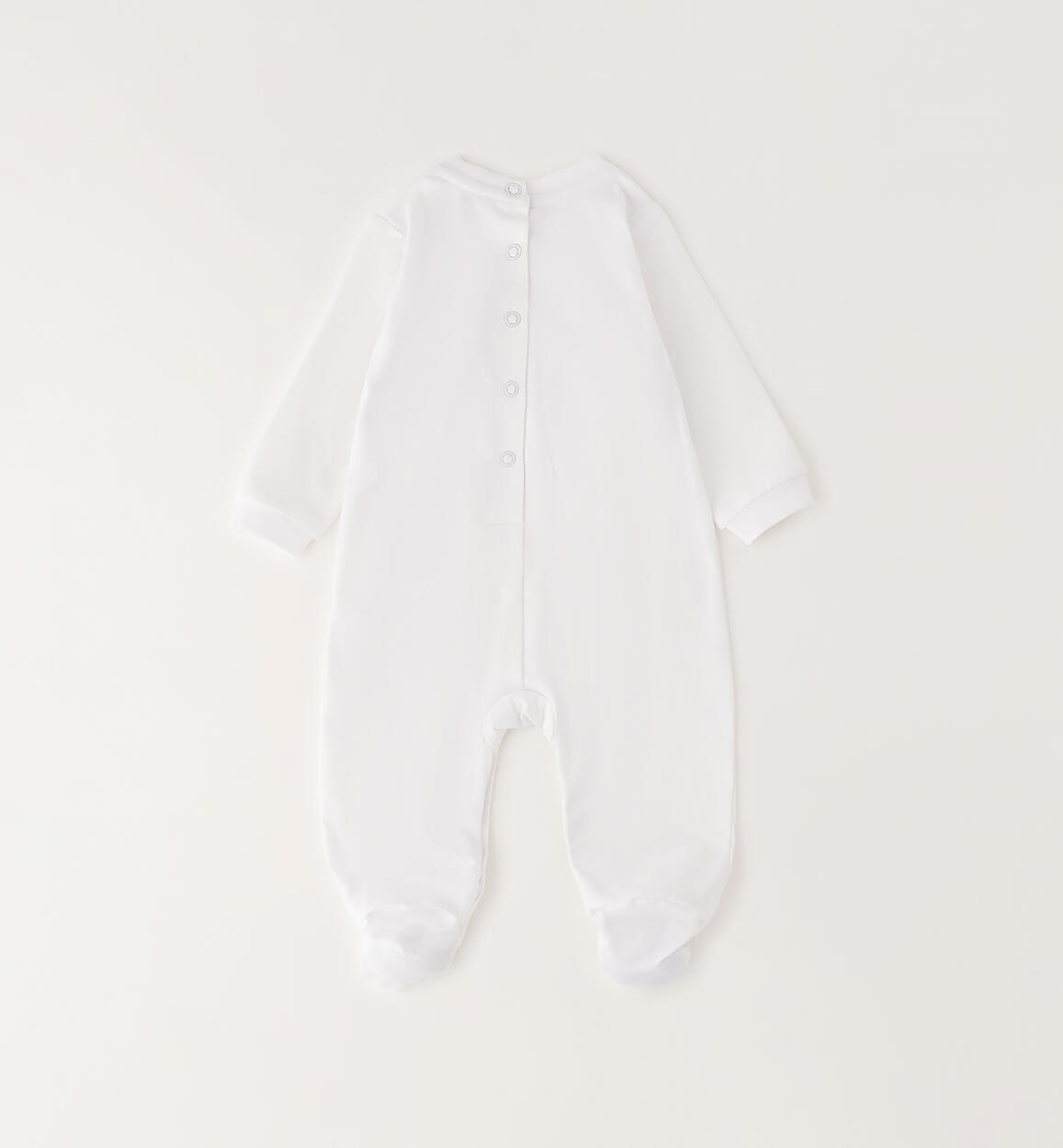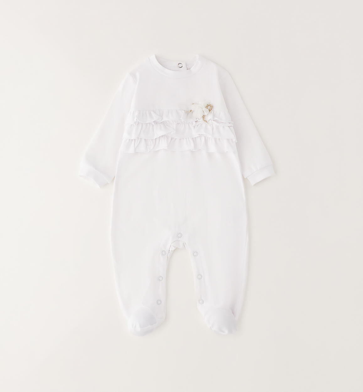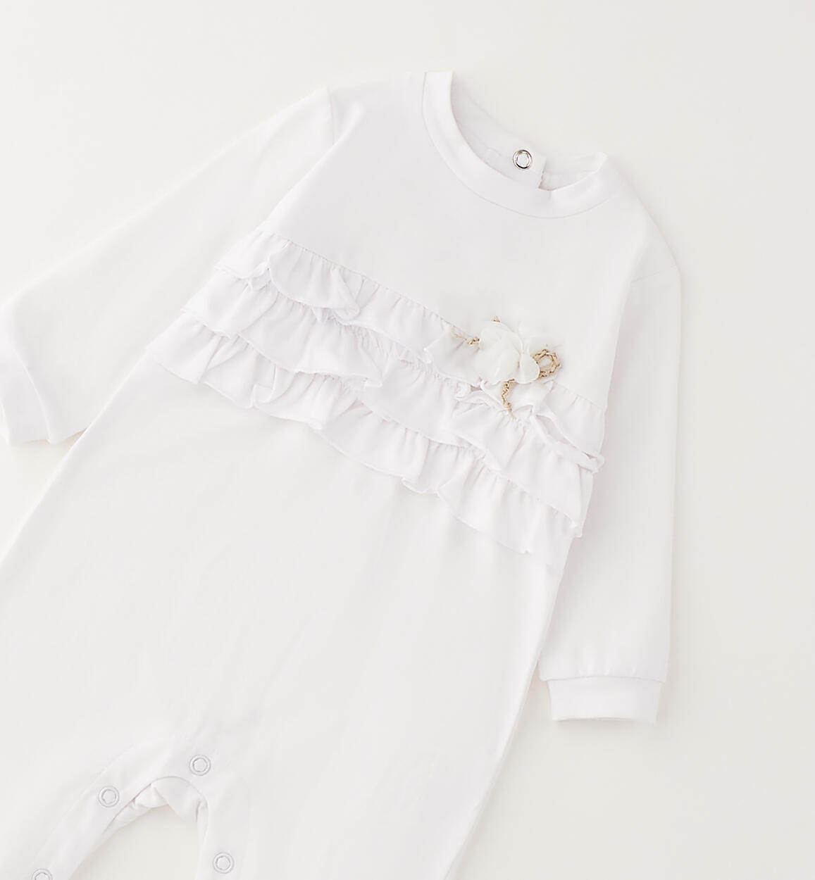 Minibanda footed onesie for newborns made of stretch cotton jersey with ruffles on the front. Appliqué flower. The style features snap-button openings at the back and crotch for easy changing and dressing. By choosing our cotton products, you support Minibanda's commitment to the Better Cotton mission. This product is supplied through a mass balance system and may not contain Better Cotton. Learn more at bettercotton.org/massbalance