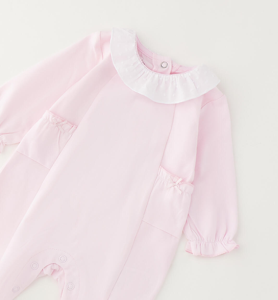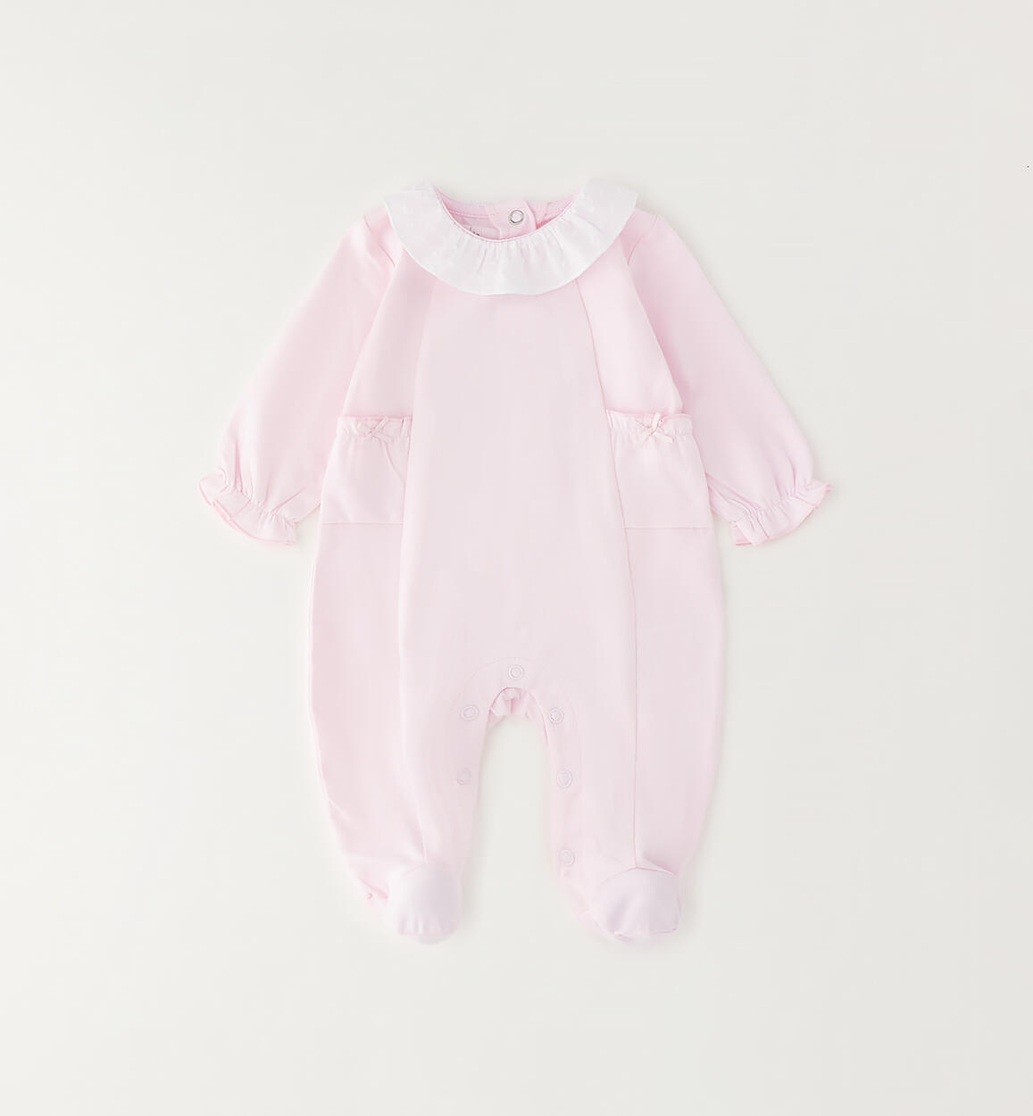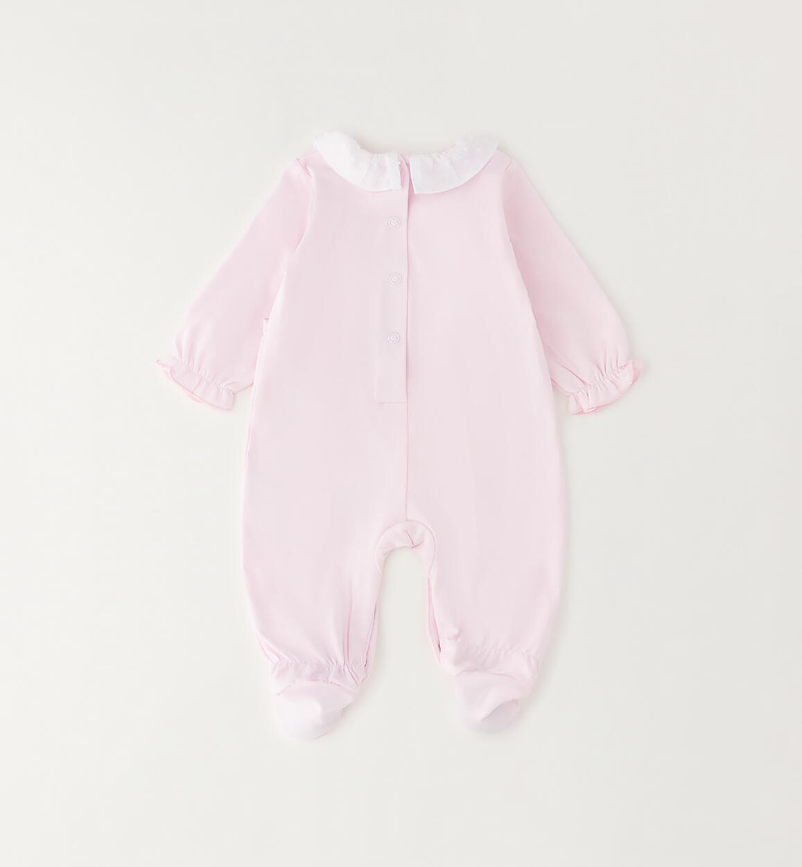 Minibanda footed onesie for newborns made of stretch jersey. The style features snap-button openings at the back and crotch for easy changing and dressing. Side pockets and small appliqué bows. By choosing our cotton products, you support Minibanda's commitment to the Better Cotton mission. This product is supplied through a mass balance system and may not contain Better Cotton. Learn more at bettercotton.org/massbalance