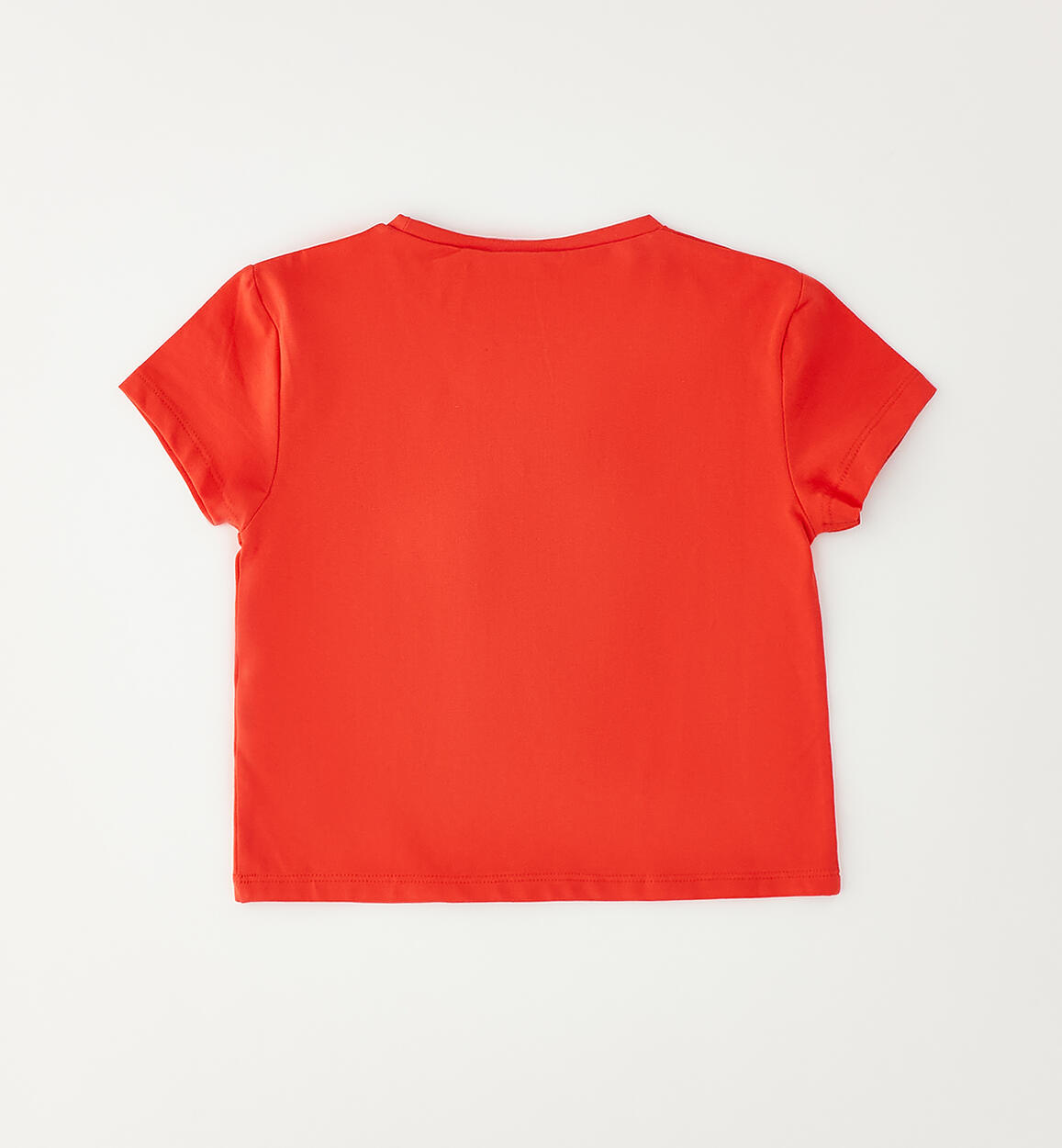 Sarabanda girls' T-shirt made of stretch cotton jersey with a print, rhinestones, and appliques. It opens at the back with buttons for sizes up to 3 years.