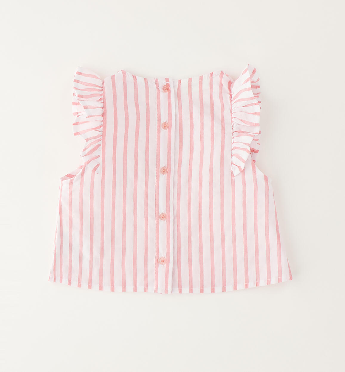 Sarabanda short-sleeved shirt for girls in striped seersucker with ruffles. It opens at the back with buttons.
