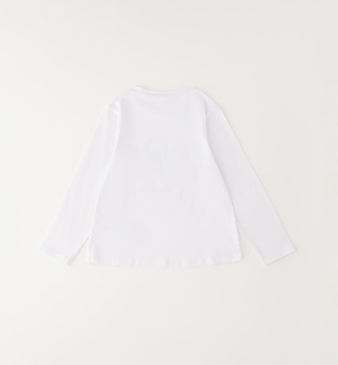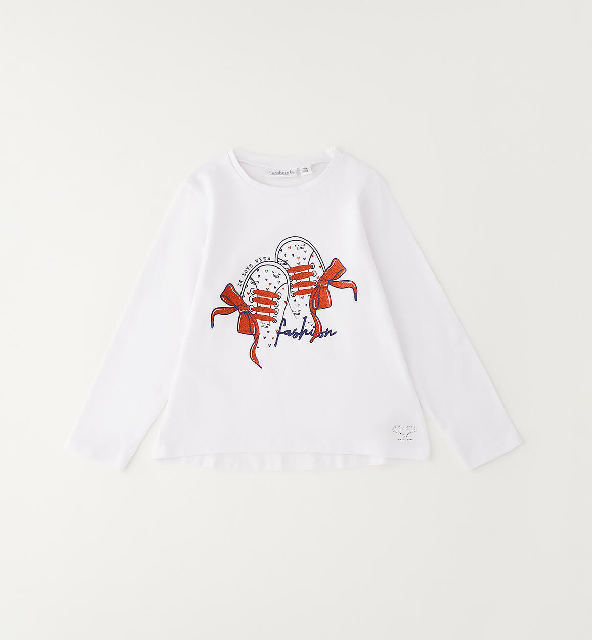 Sarabanda long-sleeved crewneck dress for girls made of stretch cotton jersey. The front features a print with glitter details. It opens at the back with buttons for sizes up to 3 years. A-line design with a longer, rounded back.
