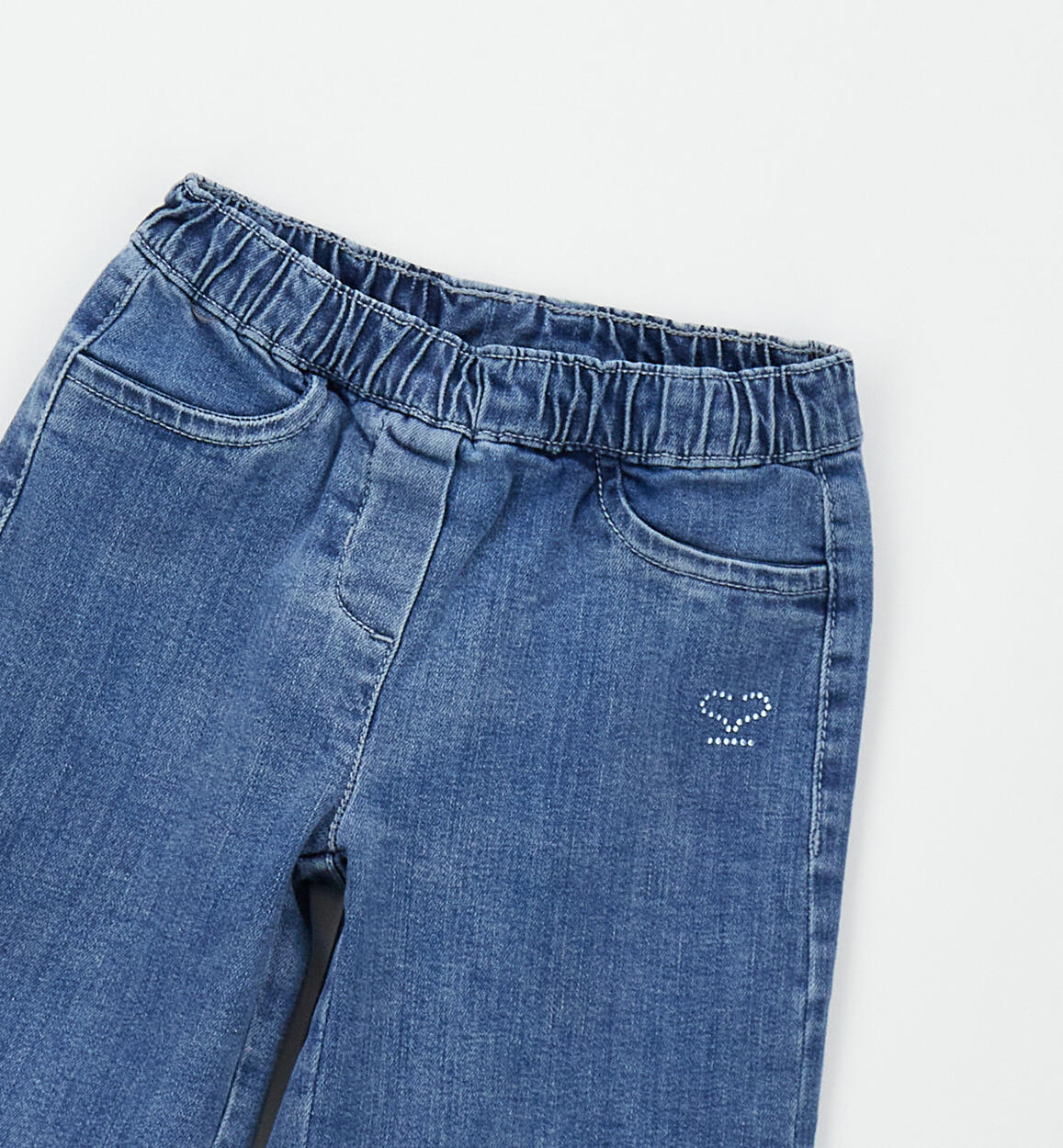 Sarabanda stretch denim long trousers for girls. Adjustable waist with internal elastic loops. Loose-fitting with elastic waistband and rhinestone logo. Cropped trousers.
