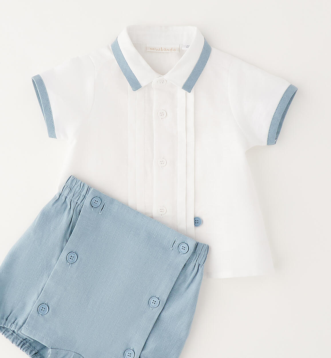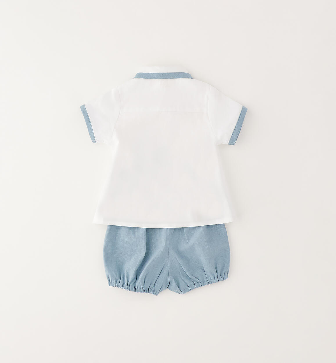 Minibanda short-sleeved baby boy's outfit made of linen and cotton. The set includes a shirt and shorts.Composition