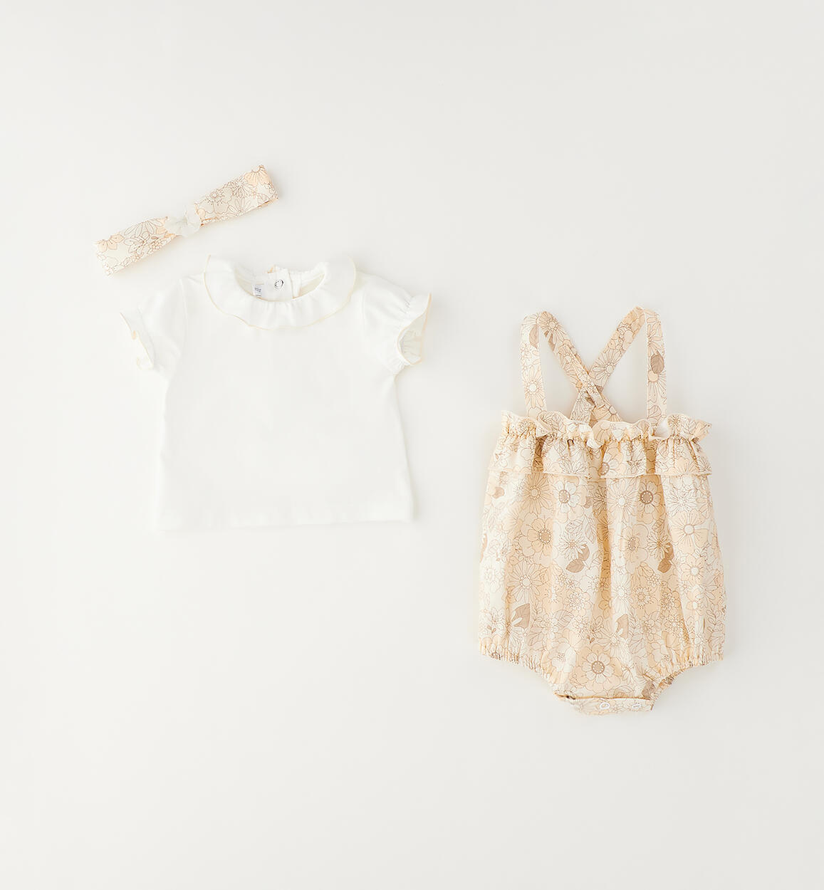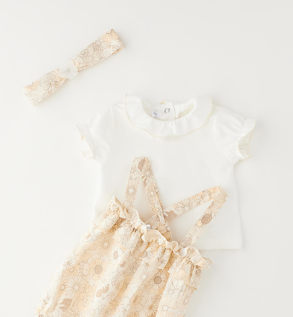 Minibanda cotton summer outfit for newborns. The T-shirt is made of stretch cotton jersey and features a snap-button opening at the back. Satin overalls with an all-over pattern feature snap-button openings at the crotch. A matching voile flower headband is included. By choosing our cotton products, you support Minibanda's commitment to the Better Cotton mission. This product is supplied through a mass balance system and may not contain Better Cotton. Learn more at bettercotton.org/massbalance