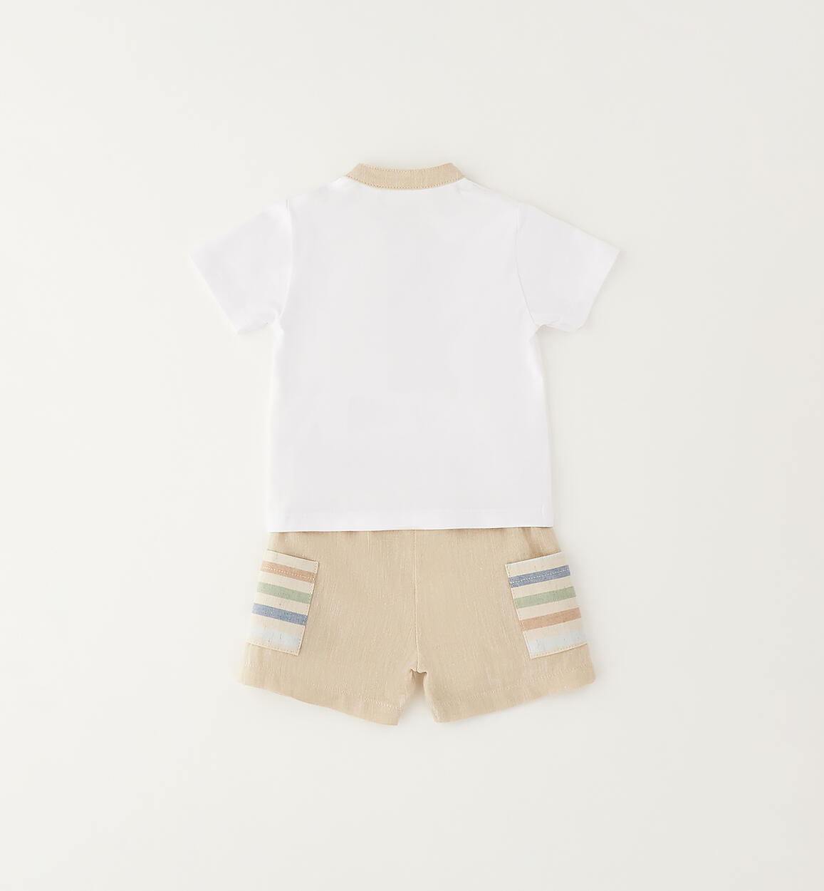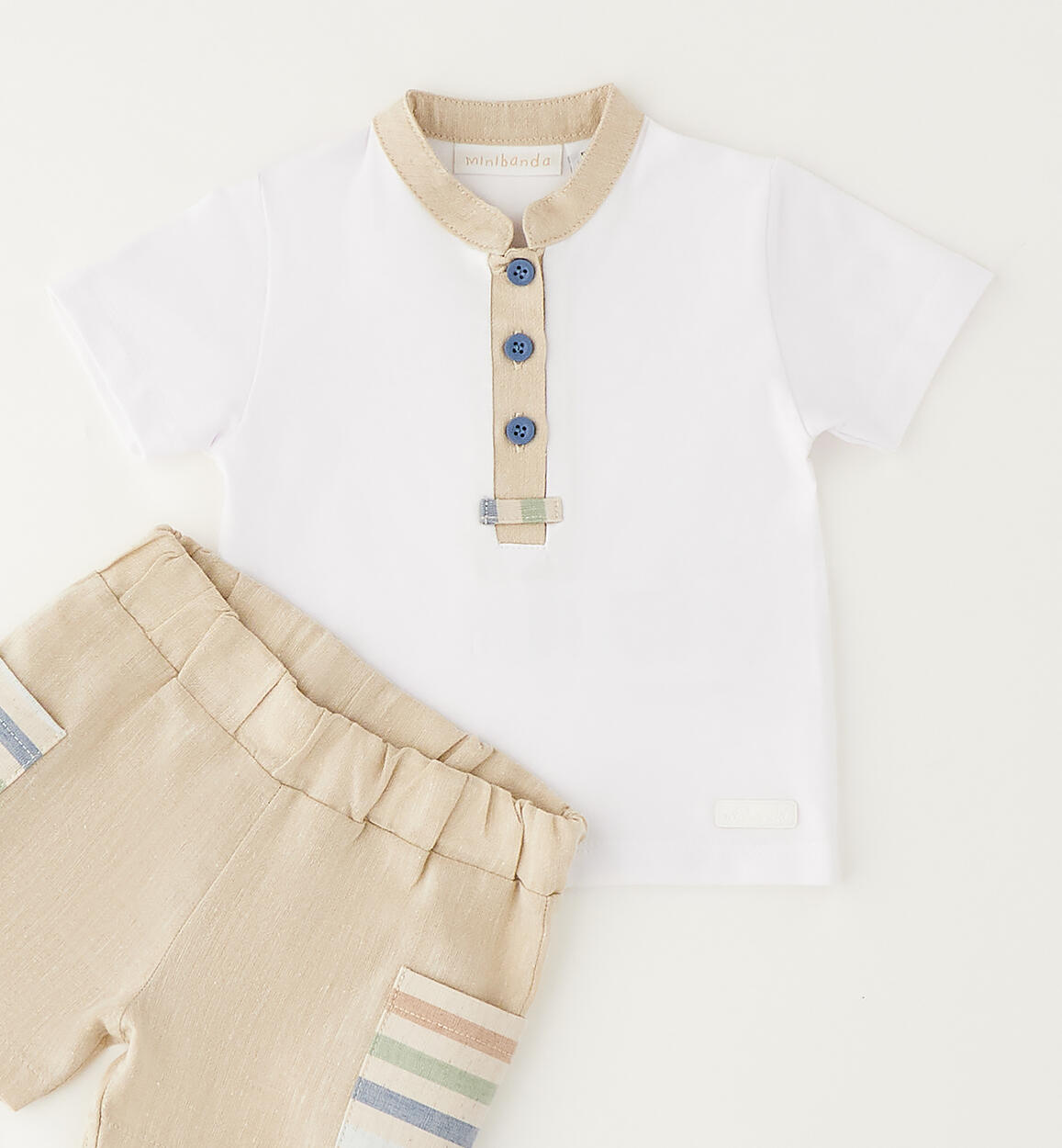 Minibanda baby boy's short-sleeved set consisting of a Henley t-shirt and shorts. The t-shirt is made of cotton jersey, and the shorts are made of linen and cotton. By choosing our cotton products, you support Minibanda's commitment to the Better Cotton mission. This product is supplied through a mass balance system and may not contain Better Cotton. Learn more at bettercotton.org/massbalanceComposition