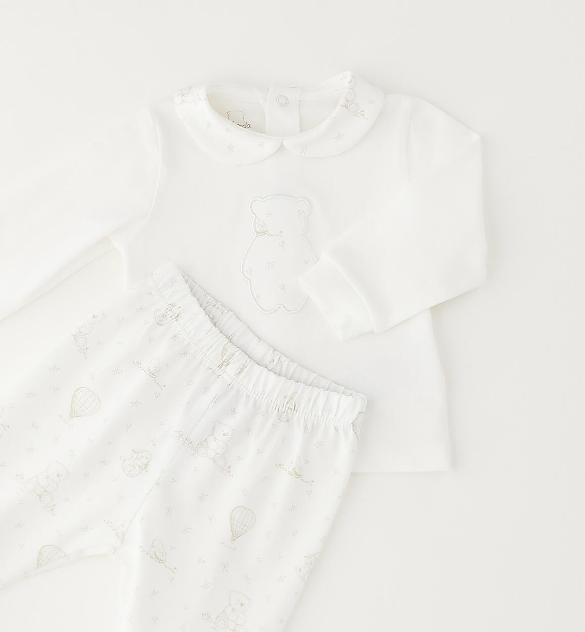 Minibanda two-piece footed onesie for newborns. Unisex model made of stretch cotton jersey. The clinical set includes: a T-shirt with a snap-button opening at the back and an embroidered appliqué on the front; and a leggings with an allover pattern. By choosing our cotton products, you support Minibanda's commitment to the Better Cotton mission. This product is supplied through a mass balance system and may not contain Better Cotton. Learn more at bettercotton.org/massbalance