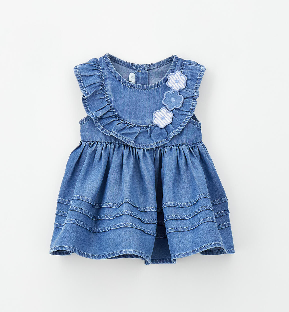 Abito smanicato per neonata Minibanda realizzato in lyocell. Modello arricchito da applicazioni a fiore e ruches. Lunghezza sopra al ginocchio. Apertura dietro con bottoni