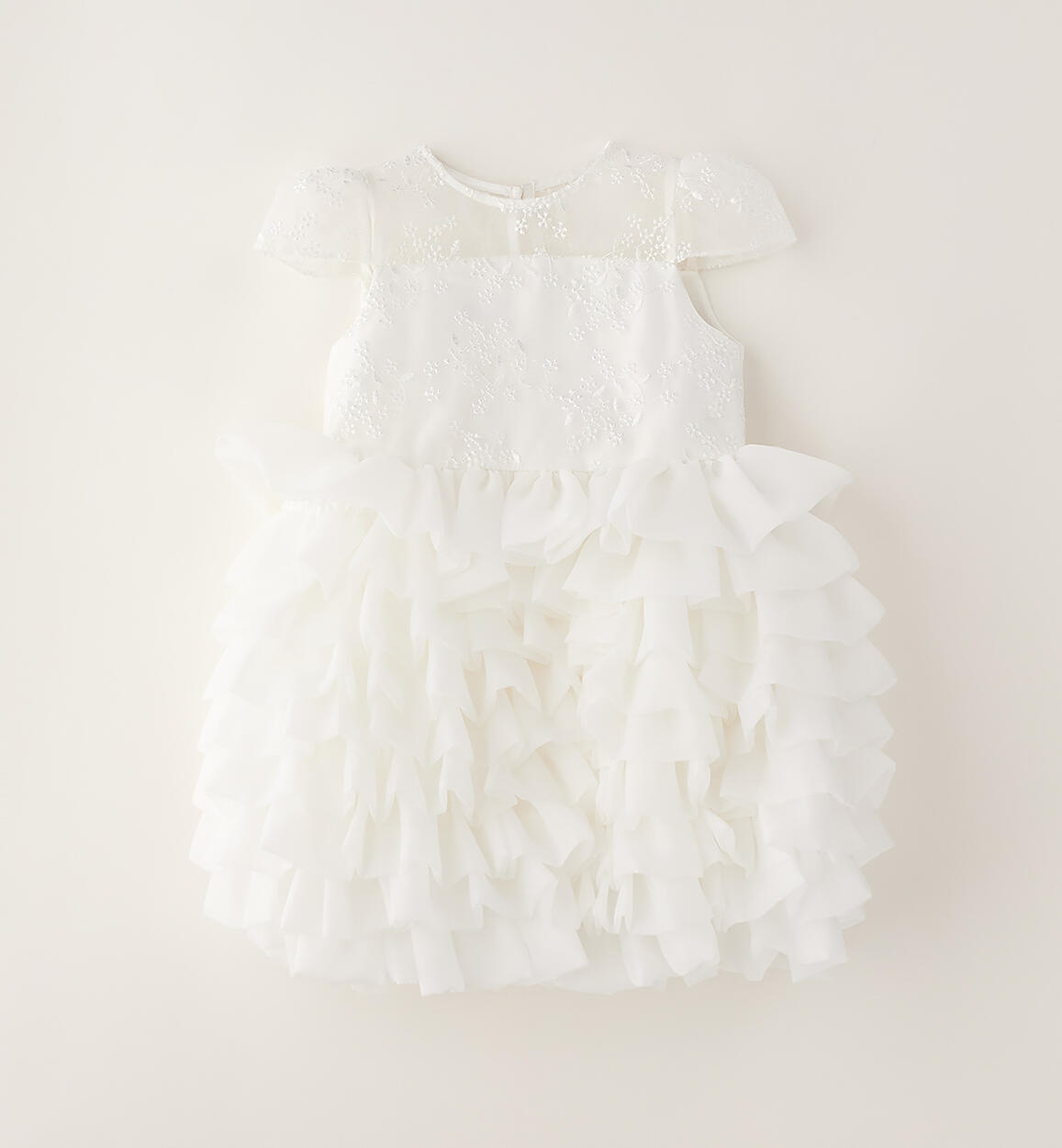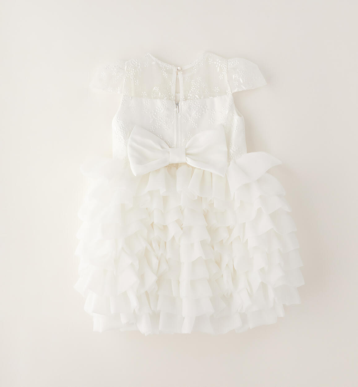 Abito da cerimonia per bambina Sarabanda realizzato in organza con fodera in cotone. Apertura dietro con zip invisibile. Lunghezza sopra al ginocchio. Top arricchito da ricamo e gonna voluminosa. Fiocco in applicazione dietro