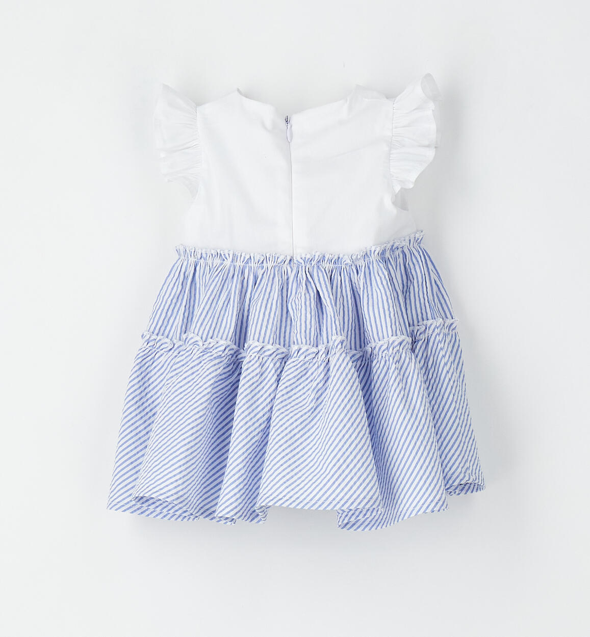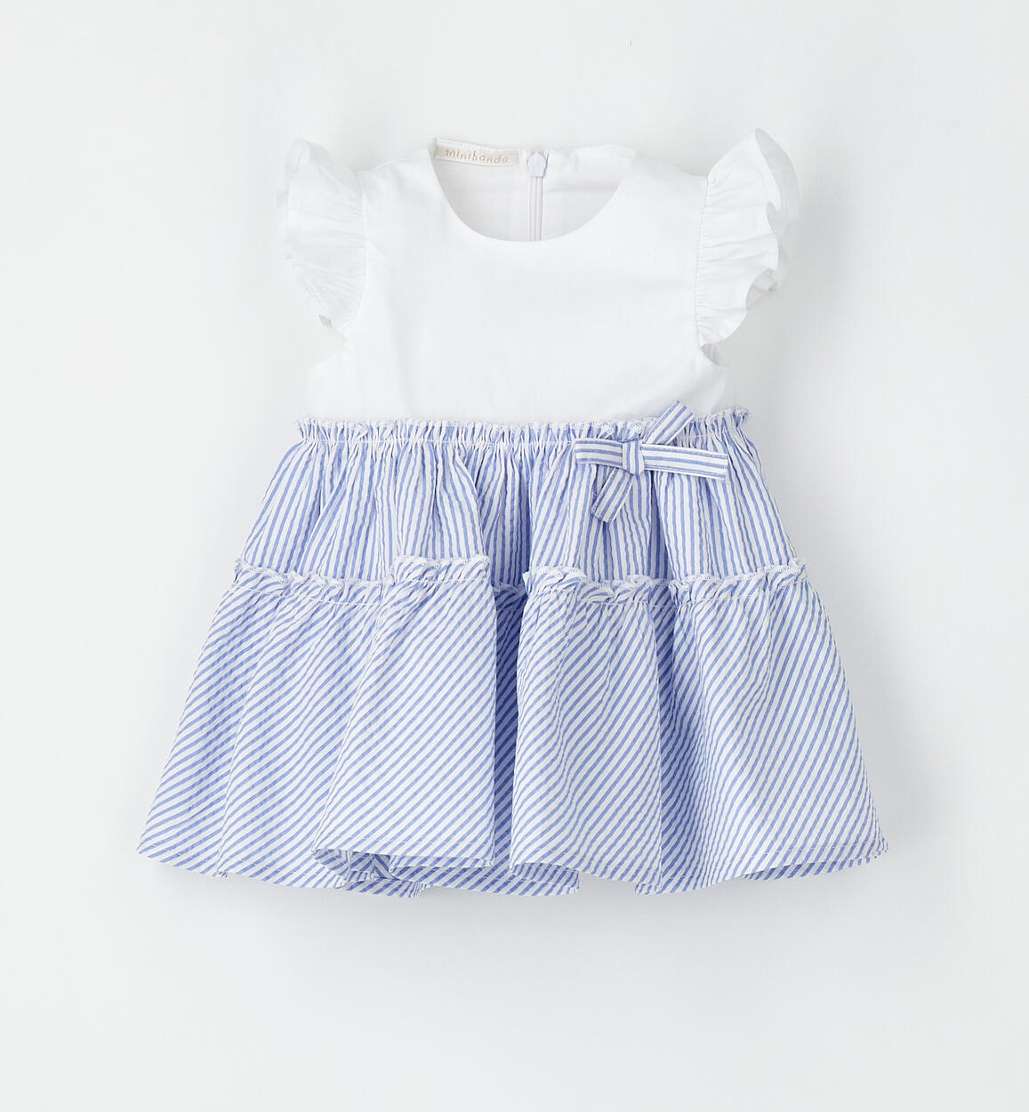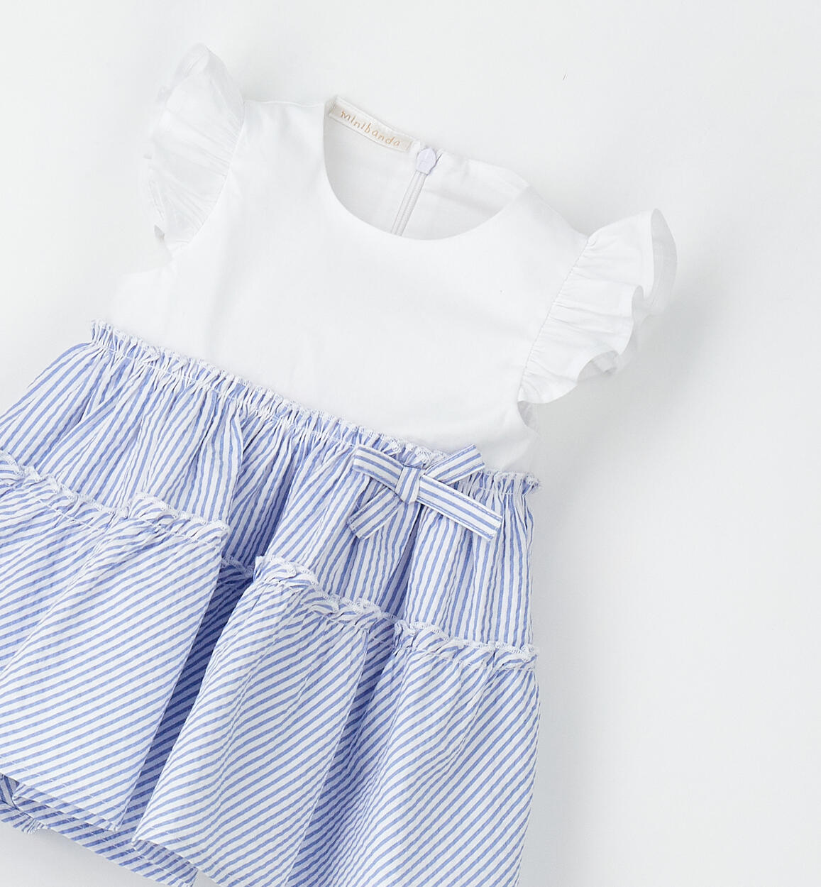 Fresco abito per bimba Minibanda realizzato in cotone. La parte sopra è in popeline stretch e la gonna in seersucker con fodera. Piccolo fiocco in applicazione. Lunghezza sopra al ginocchio. Apertura dietro con zip invisibile. Scegliendo i nostri prodotti in cotone, sostieni l'impegno di Minibanda nella missione Better Cotton. La fornitura di questo prodotto avviene tramite un sistema di bilancio di massa e potrebbe non contenere Better Cotton. Leggi di più su bettercotton.org/massbalance