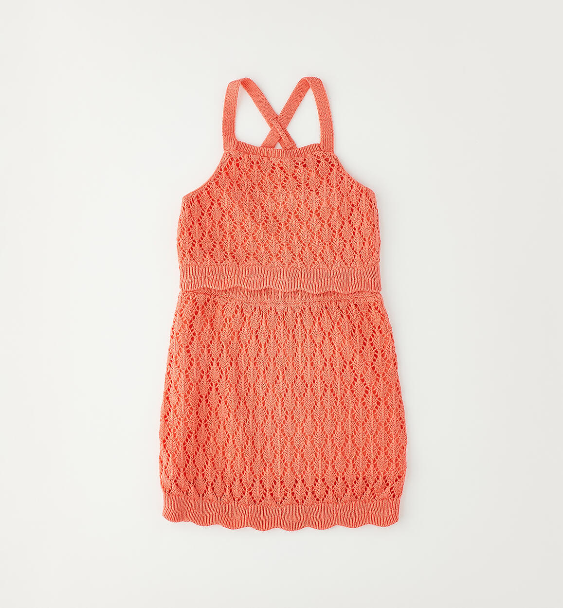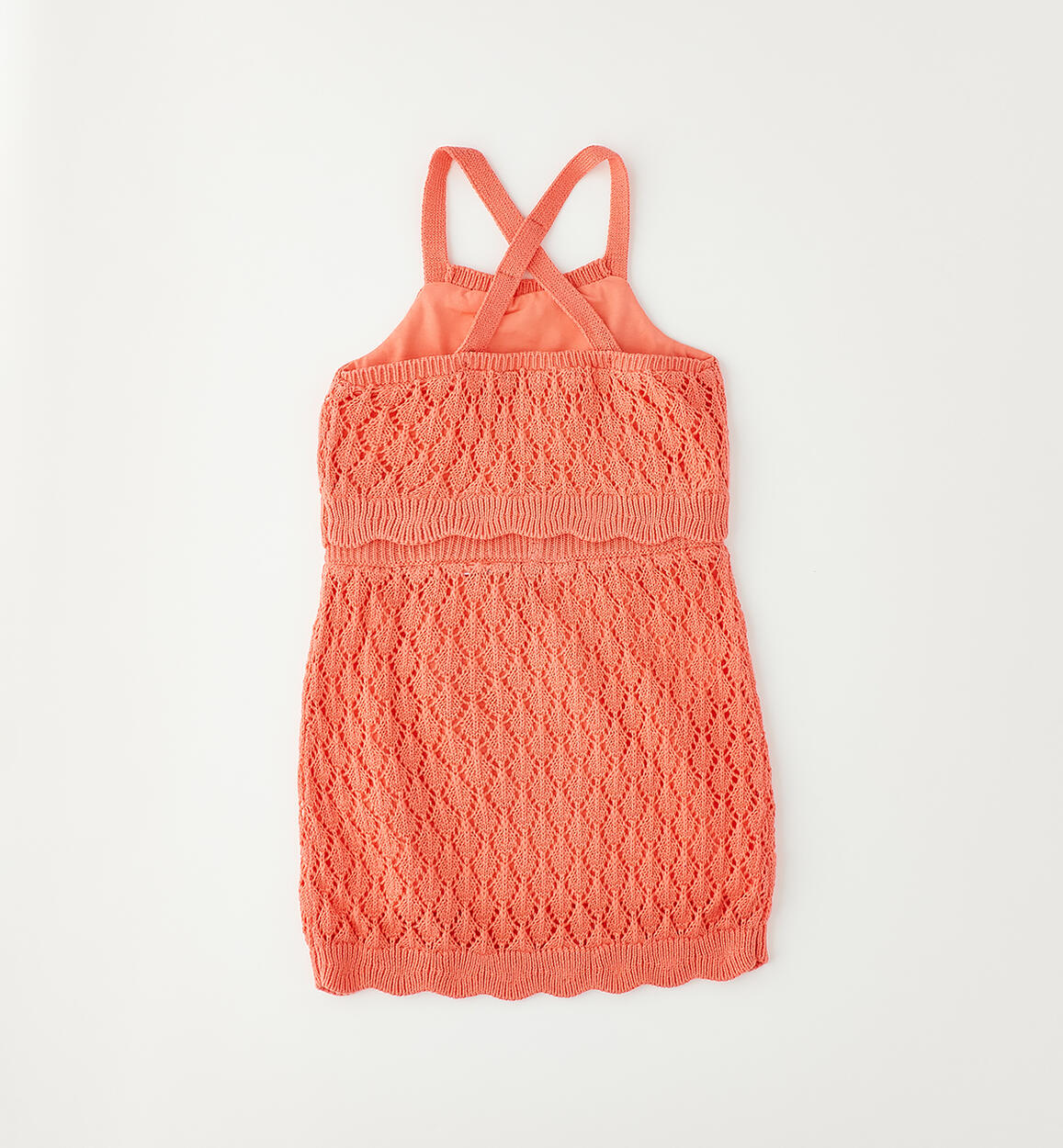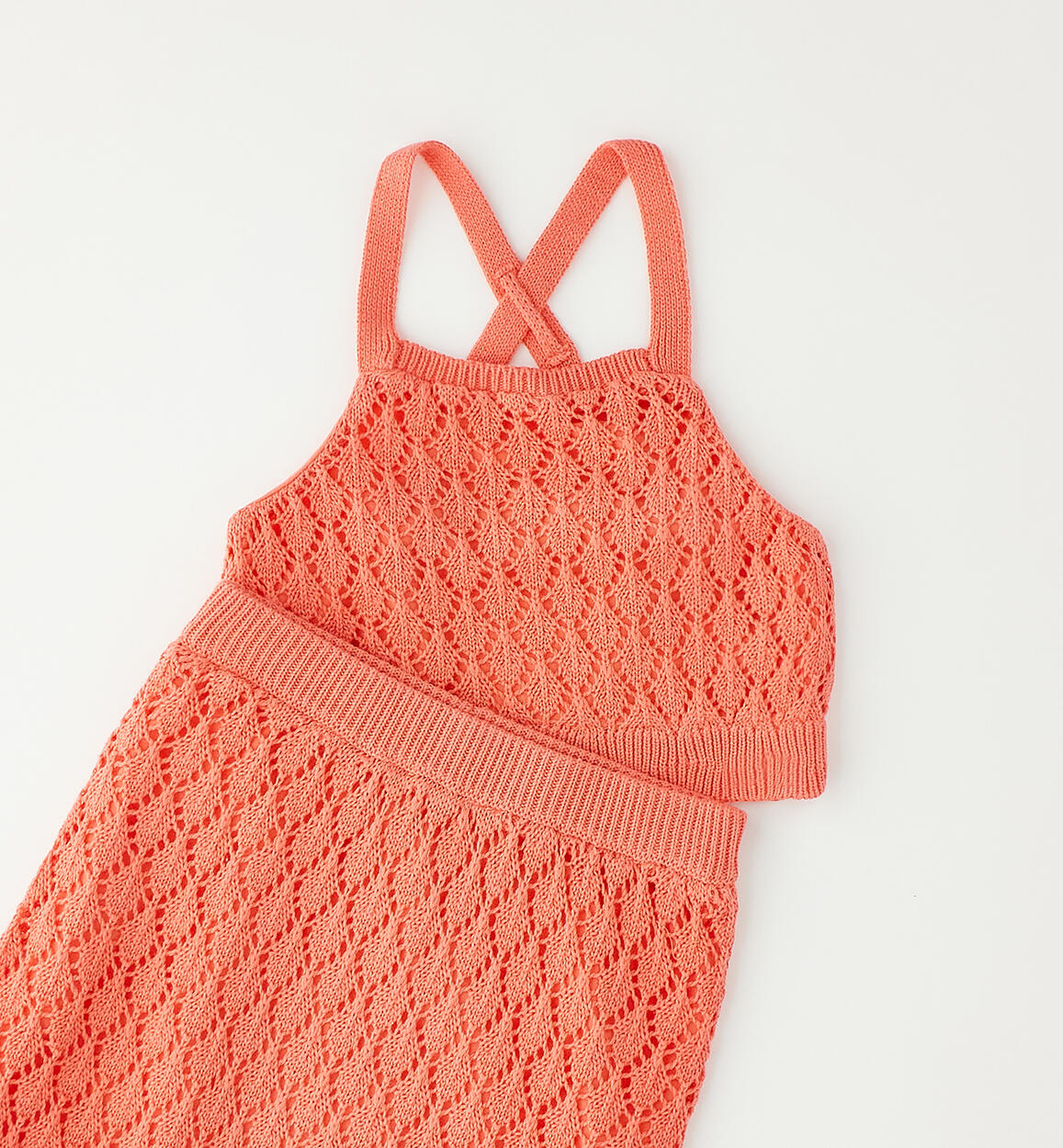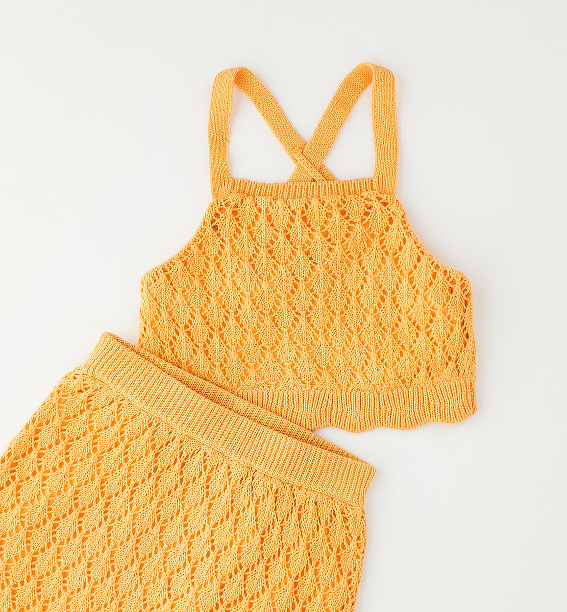 Grazioso completo per bambina Sarabanda realizzato in tricot traforato 100% cotone con fodera in jersey stretch. Il completo è composto da canotta e gonnaComposizione
