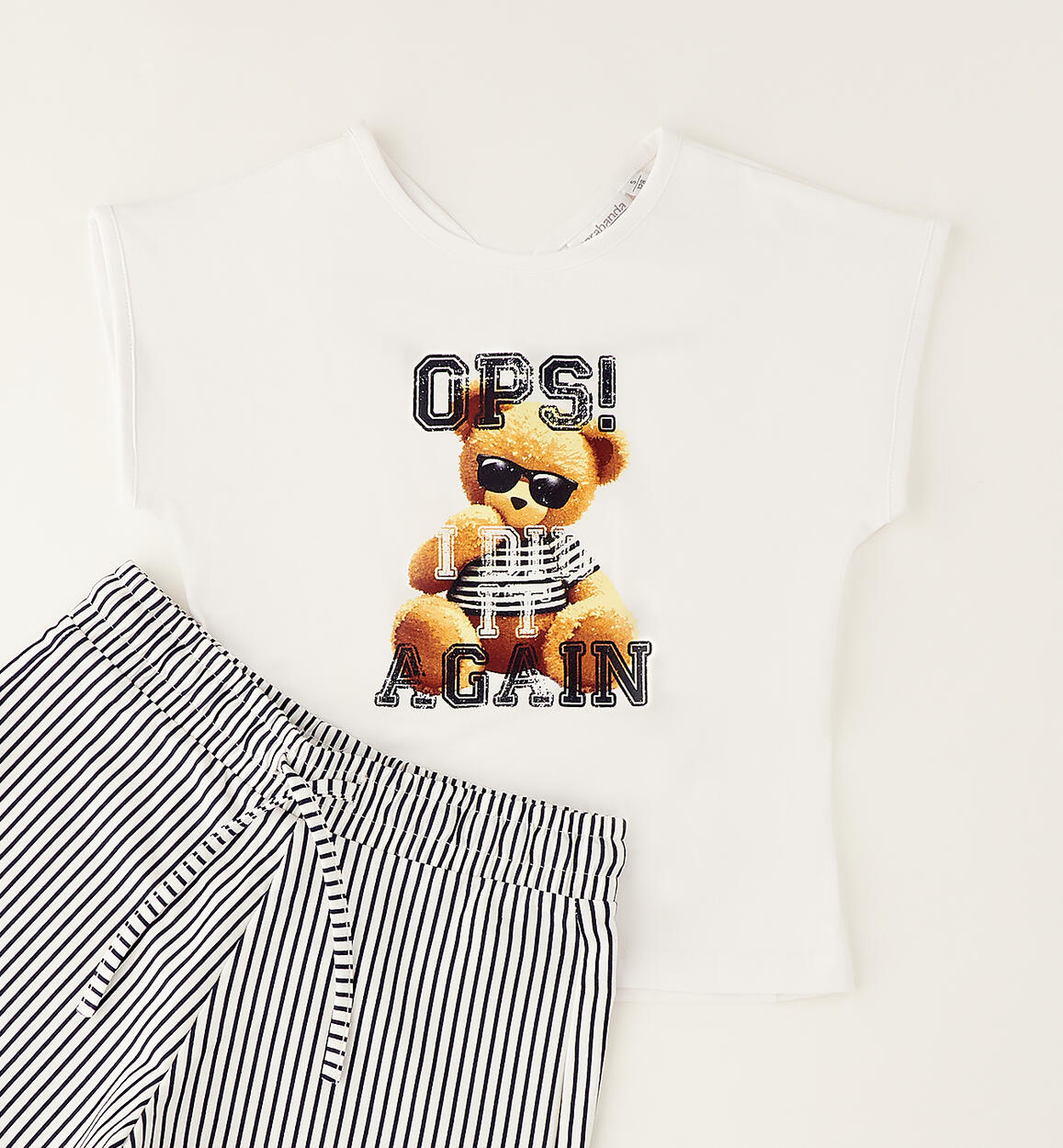 Completo estivo per ragazza Sarabanda realizzato in cotone stretch. T-shirt in jersey con stampa davanti e particolare spacco sulla schiena. Short a righe, realizzati in felpa stretch, con elastico in vita e coulisse