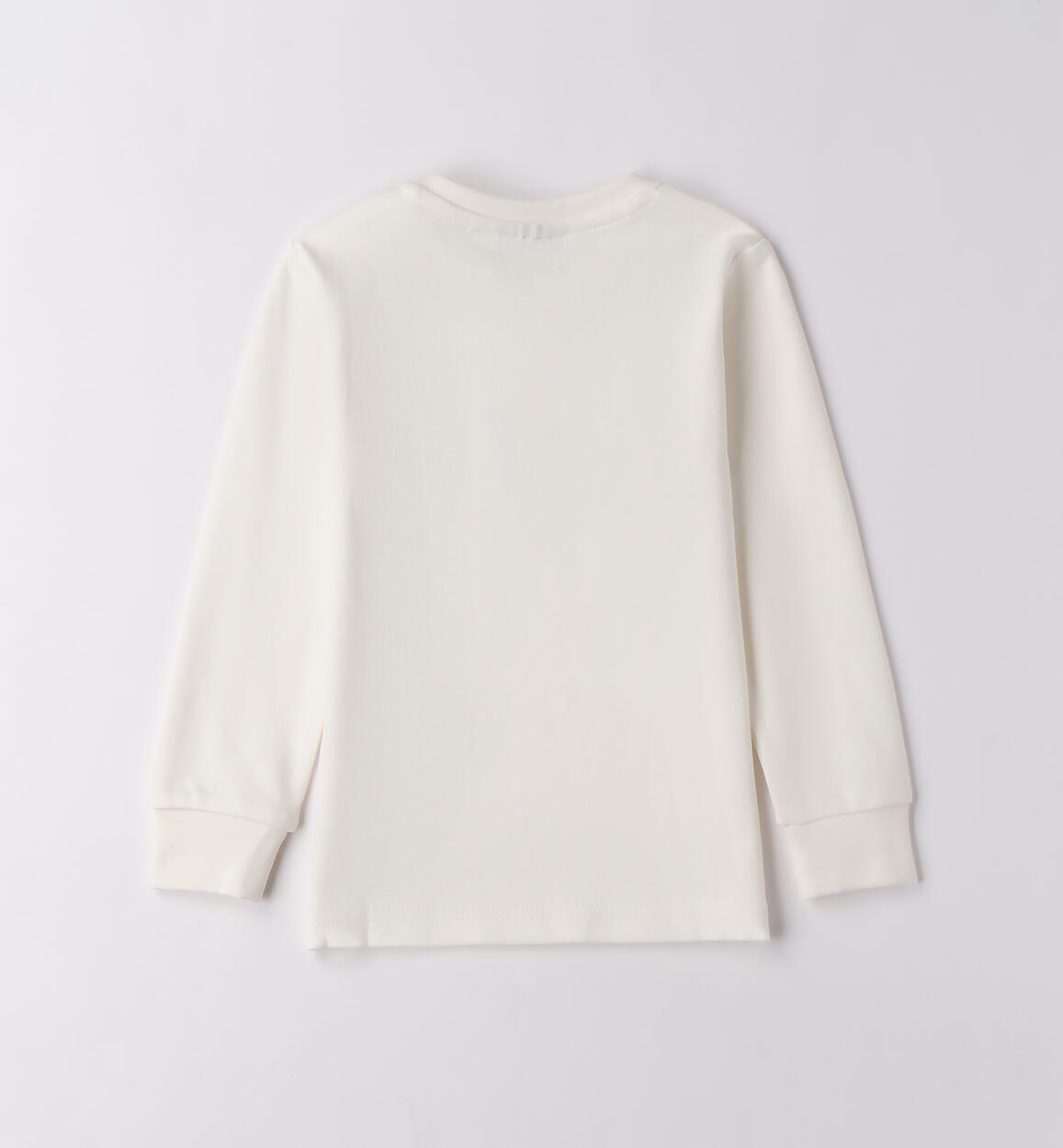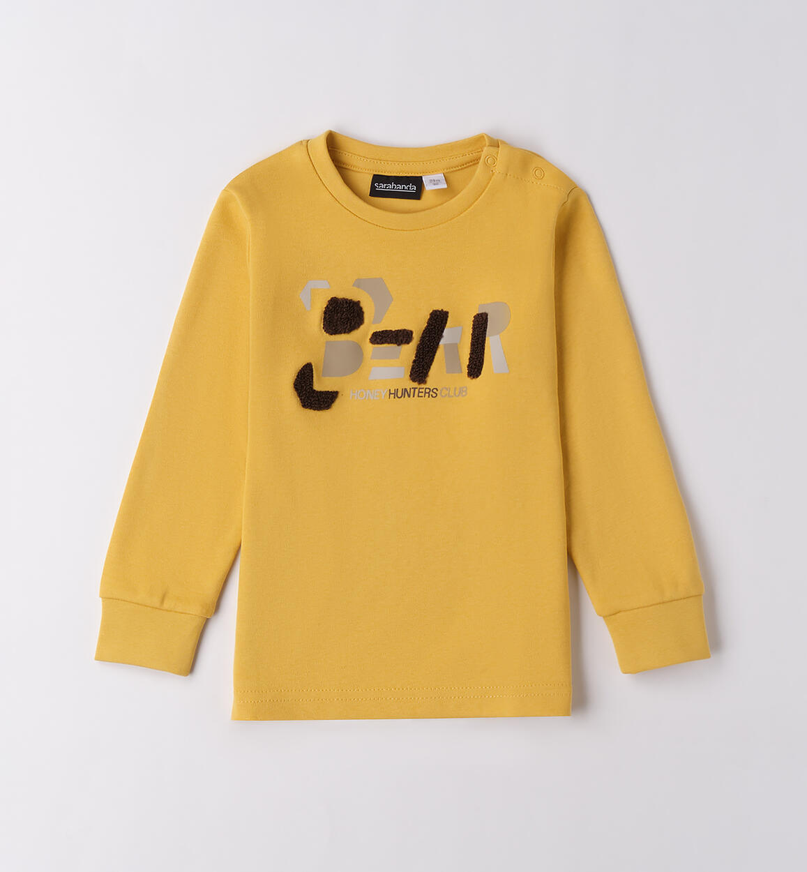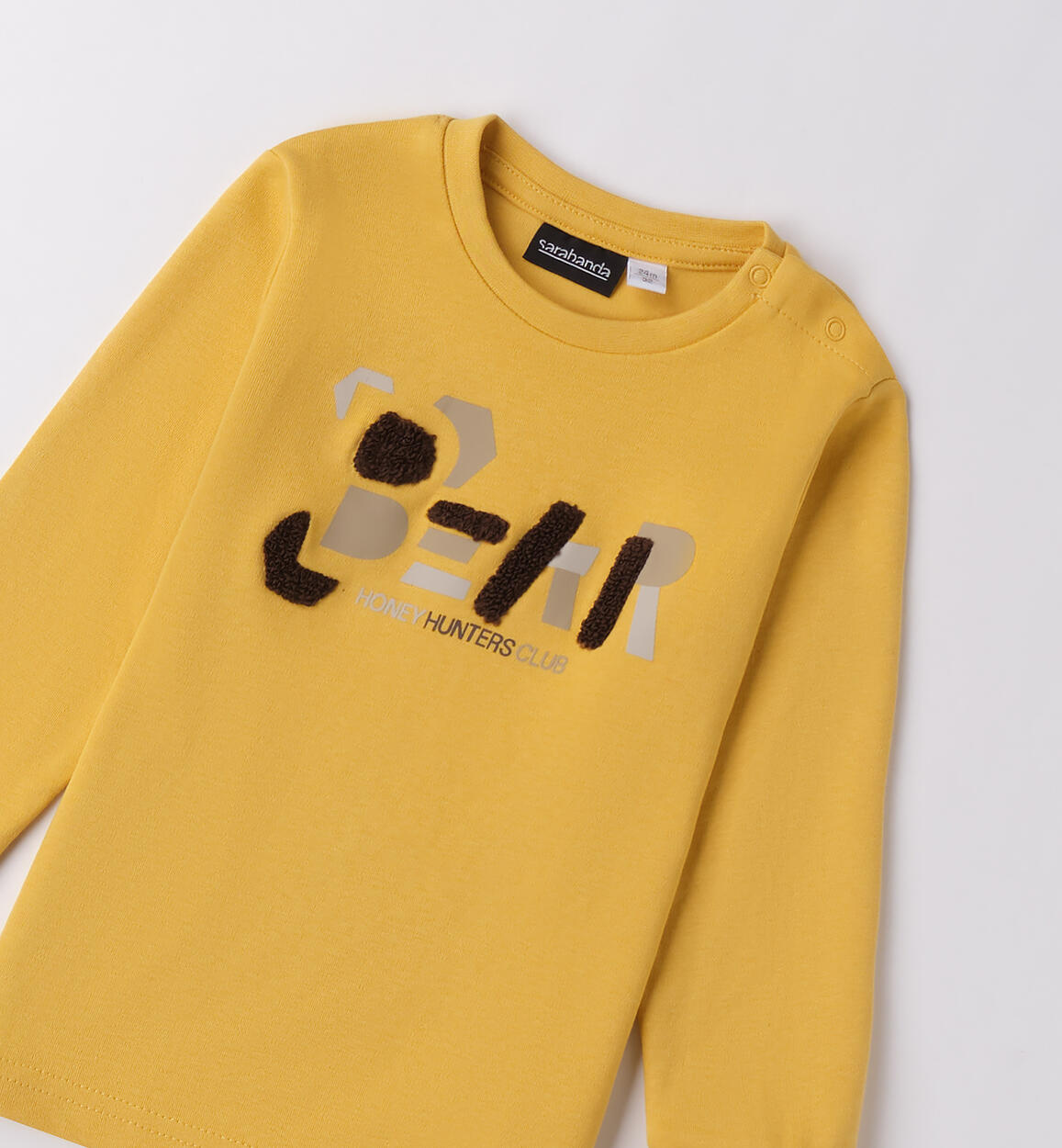 Maglietta per bambino Sarabanda 9 mesi - 8 anni realizzata in interlock 100% cotone. Il modello presenta apertura sulla spalla con bottoni a pressione fino alla taglia 3 anni. La maglietta è girocollo con polsini sulle maniche, stampe e ricamo spugna