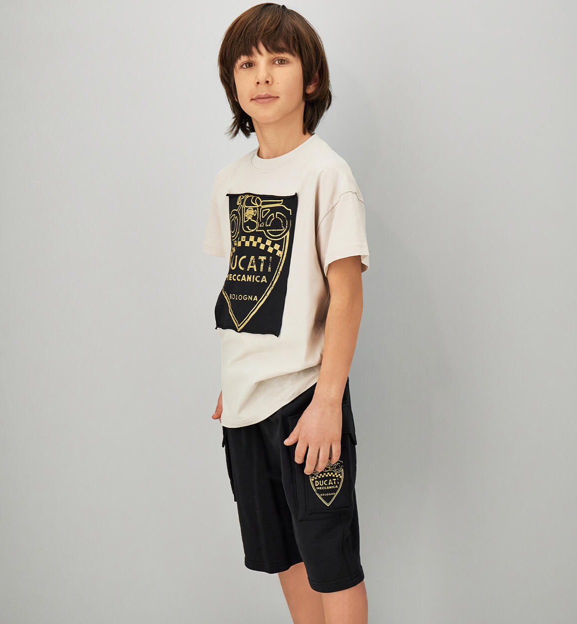 Pantalone corto in french terry per ragazzo Sarabanda. Modello con elastico in vita e coulisse, tasconi laterali e stampe. Pantalone basket con lunghezza sotto al ginocchio. Scegliendo i nostri prodotti in cotone, sostieni il nostro investimento nella missione Better Cotton. La fornitura di questo prodotto avviene tramite un sistema di bilancio di massa e potrebbe non contenere Better Cotton. Leggi di più su bettercotton.org/massbalance