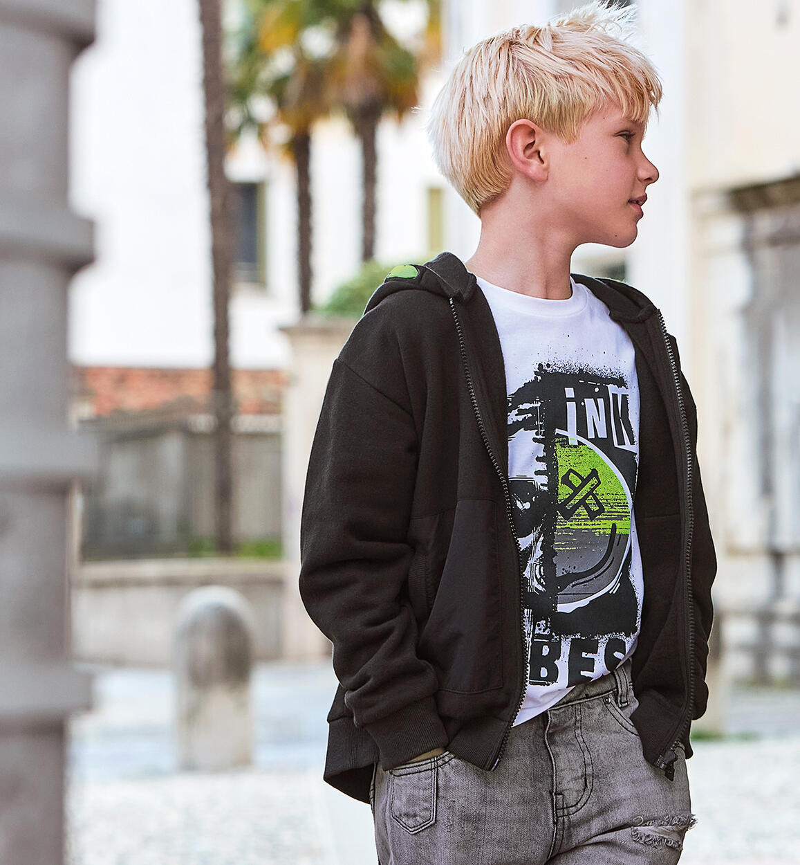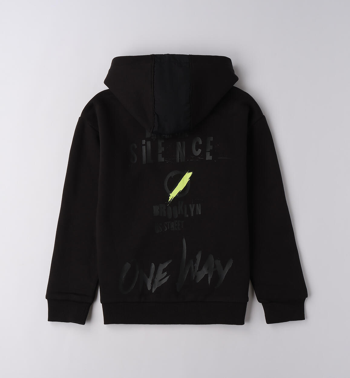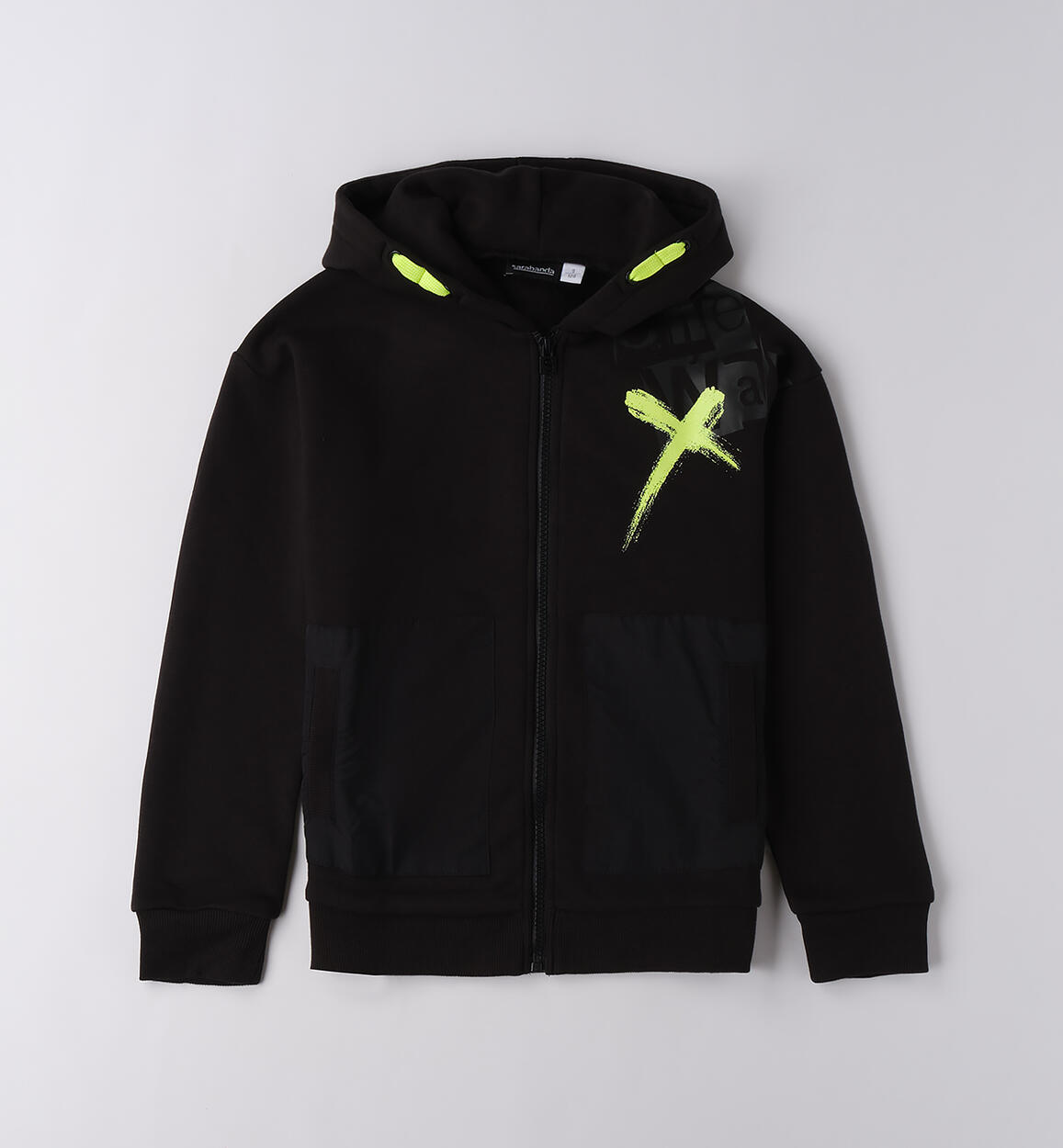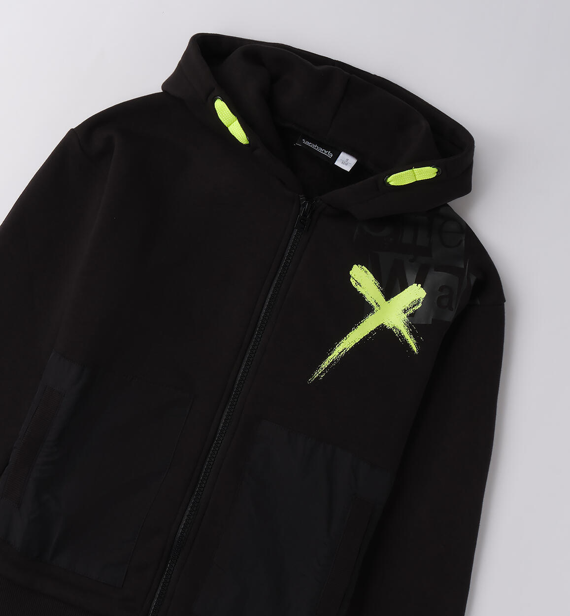 Felpa per ragazzo Sarabanda 8-16 anni realizzata in felpa invernale con felpatura interna. Modello con cappuccio, apertura con zip, dettagli fluo, inserti in nylon. Spalla scesa con vestibilità più ampia