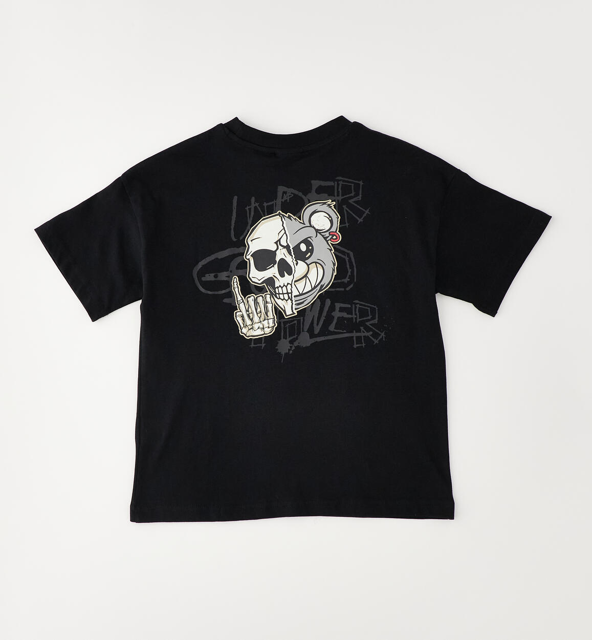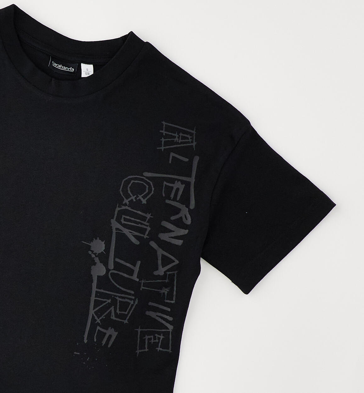 T-shirt per ragazzo Sarabanda realizzata in jersey 100% cotone con stampa davanti e dietro. Vestibilità over