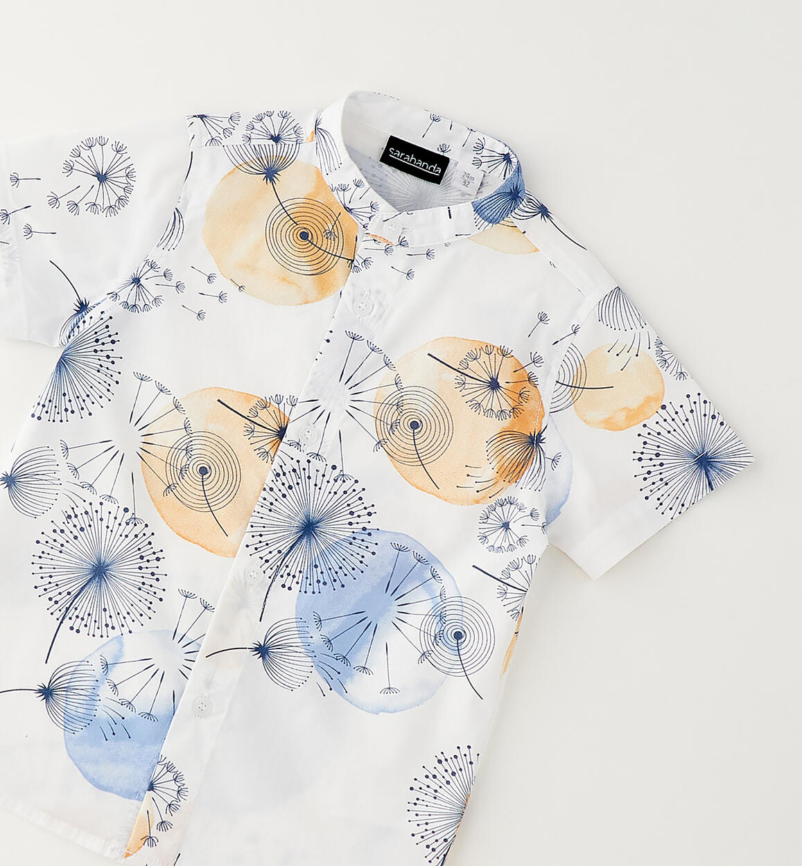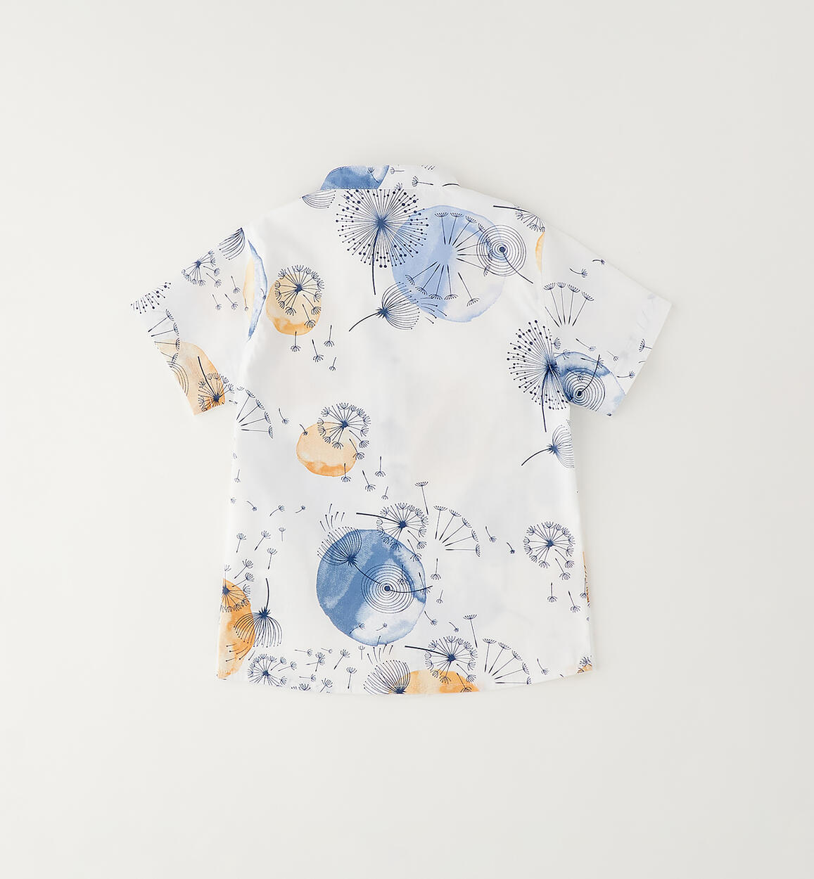 Camicia a manica corta per bambino Sarabanda realizzata in popeline di cotone. Apertura con bottoni, colletto alla caoreana e fantasia all overComposizione