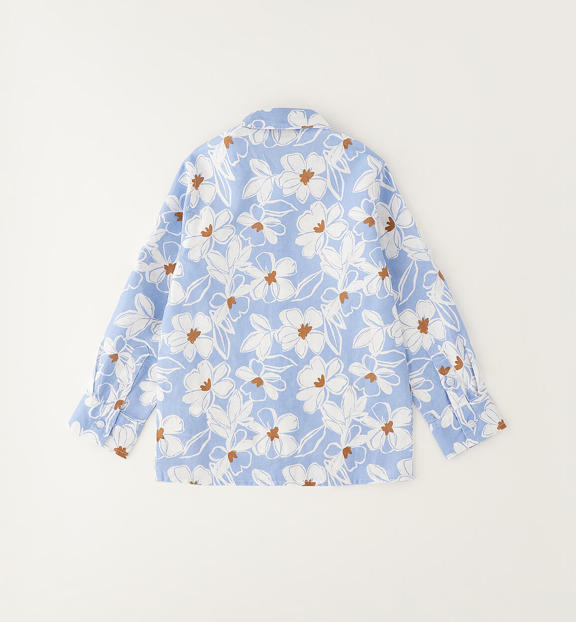 Camicia a manica lunga per bambino Sarabanda realizzata in lino e cotone dalla fantasia a fiori. Apertura con bottoni e taschino davanti
