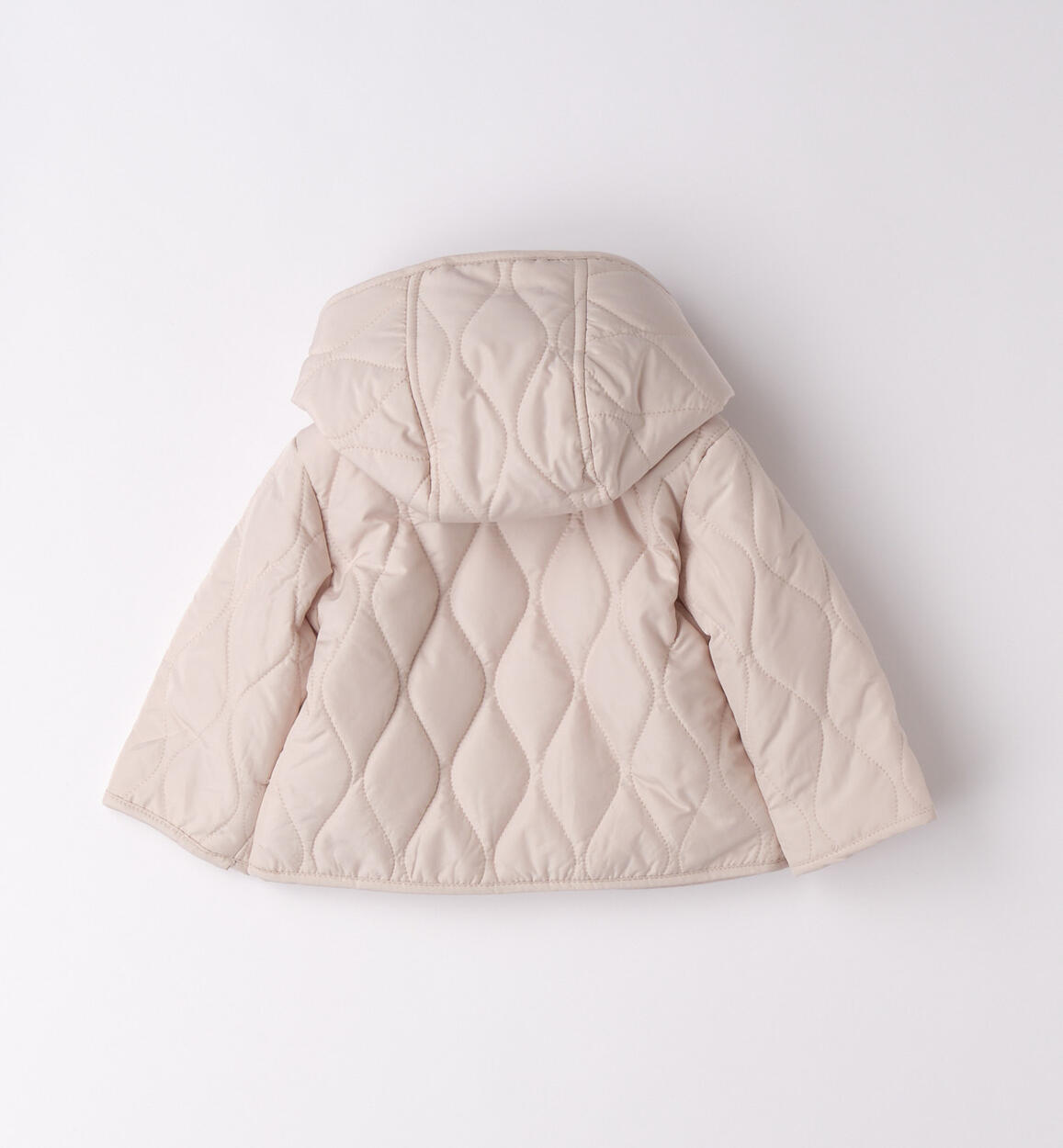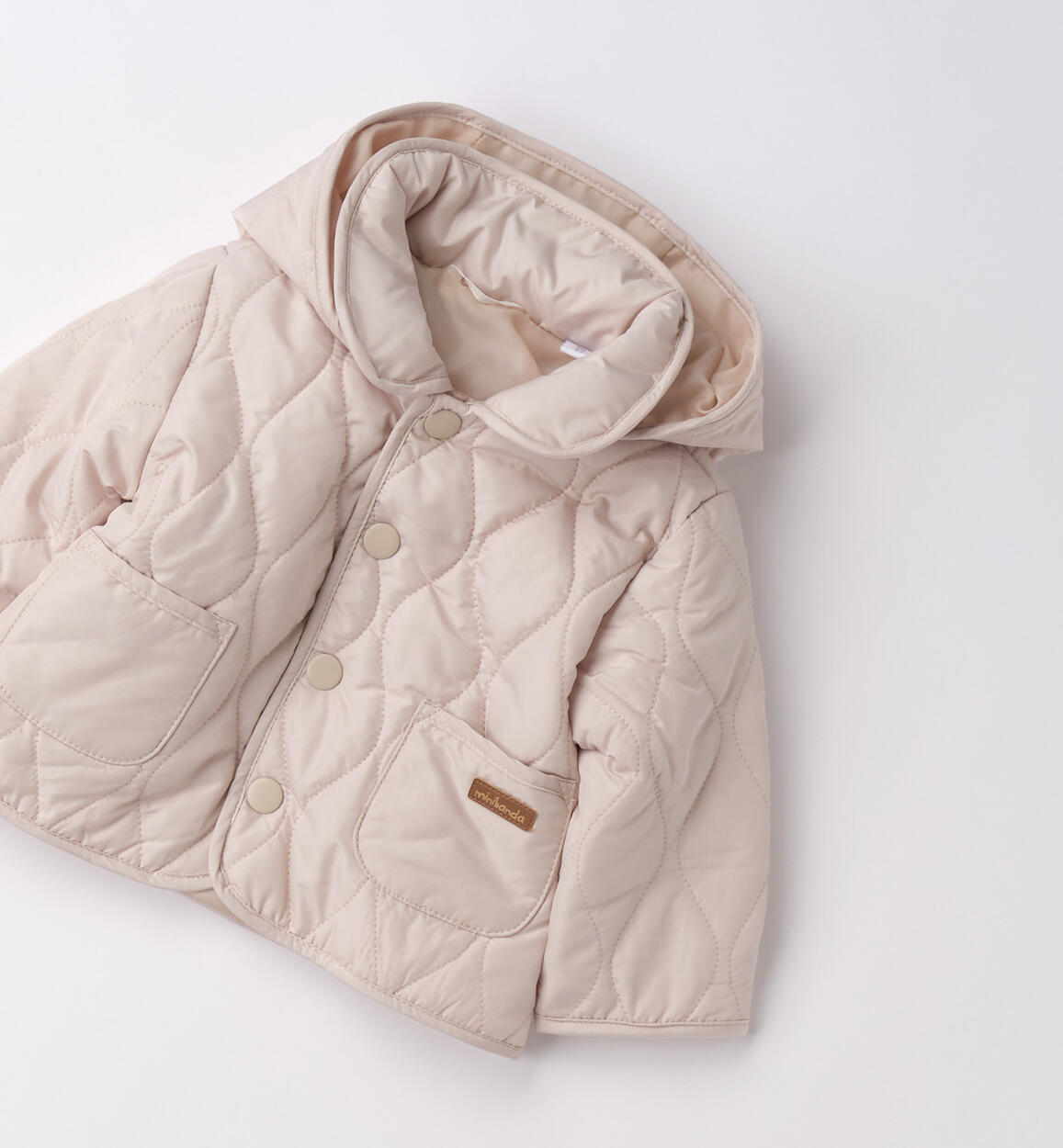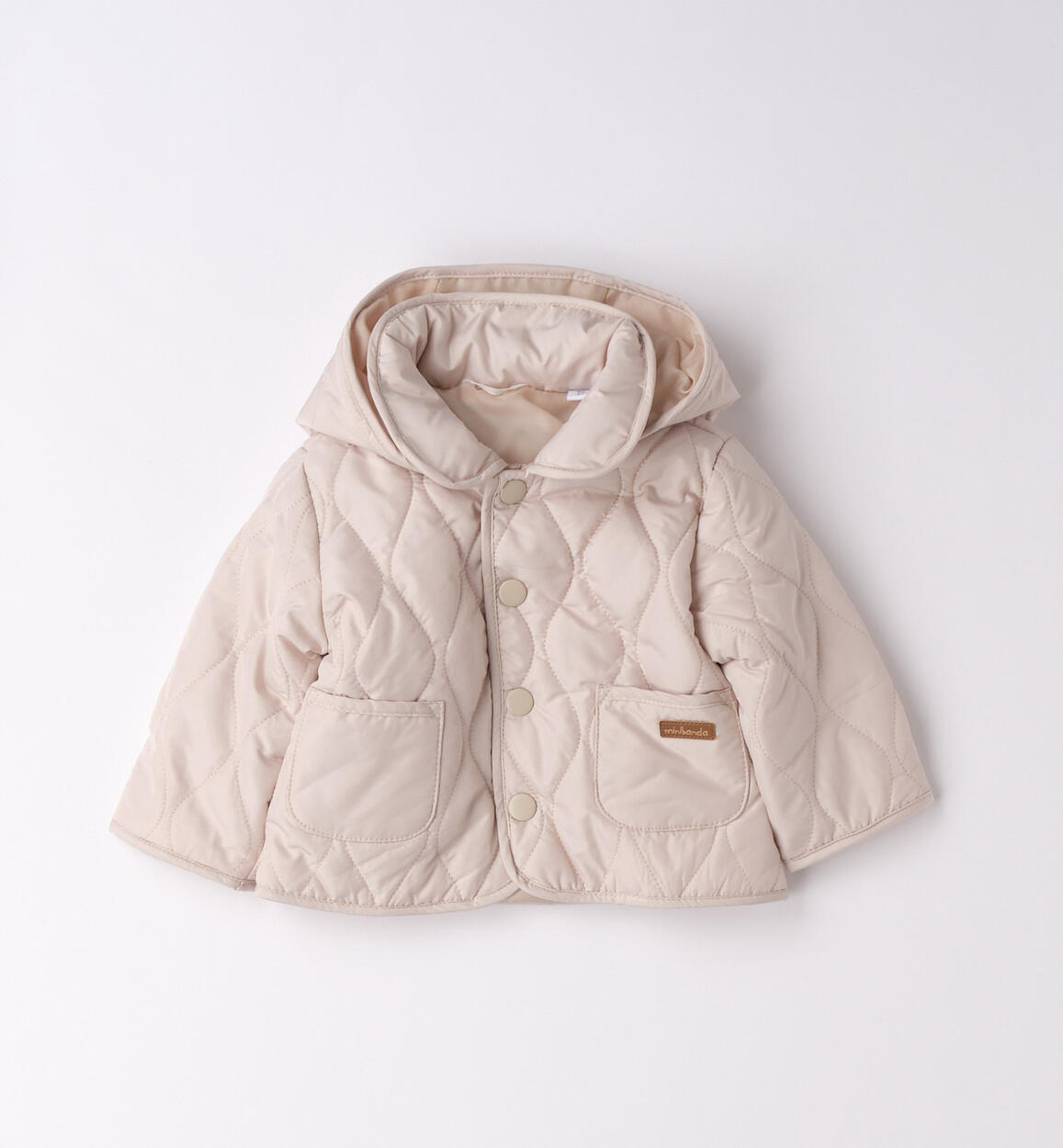 Giubbotto per neonato Minibanda realizzato in microfibra con leggera imbottitura in ovatta. Modello 100 grammi, con tasche, apertura con bottoni e cappuccio staccabile. Il prodotto non contiene materiali di derivazione animale. Animal free è un marchio di LAV www.animalfree.info
