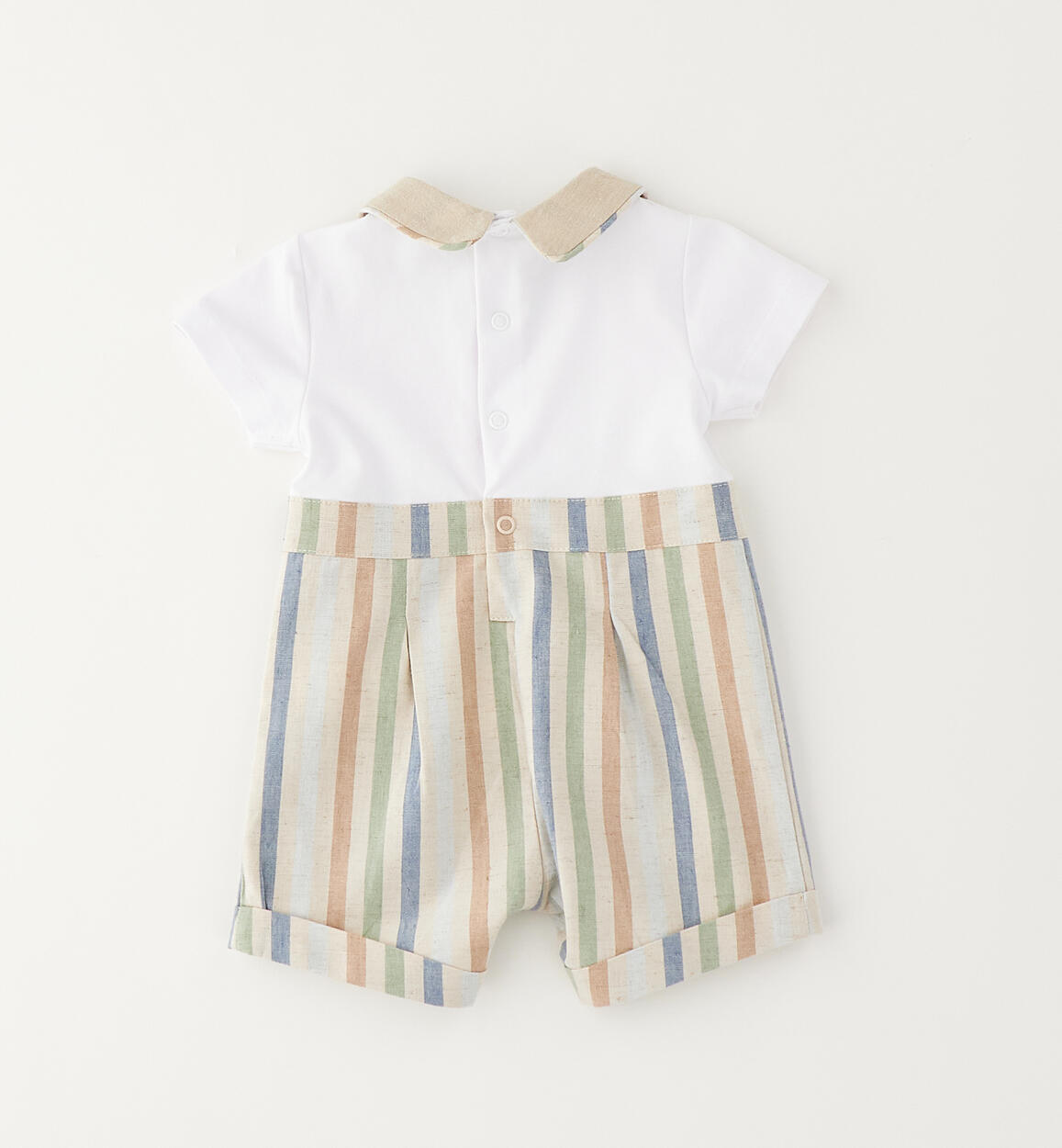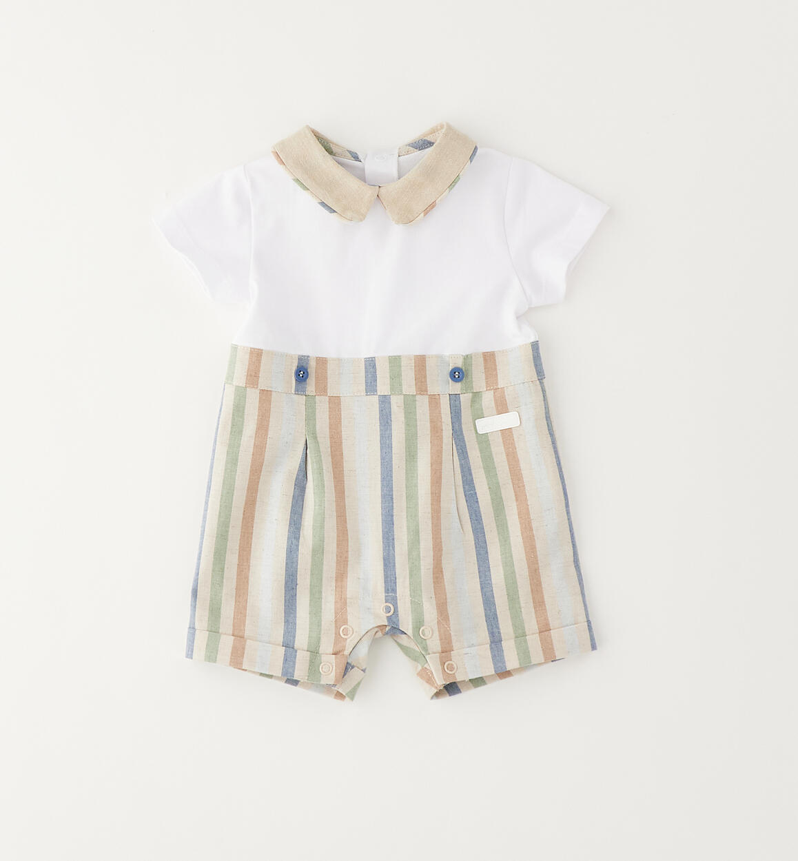 Pagliaccetto per neonato Minibanda realizzato con la porta sopra in jersey e la parte sotto in lino e cotone rigato. Apertura dietro e nell'interno gamba con bottoni a pressione. Scegliendo i nostri prodotti in cotone, sostieni l'impegno di Minibanda nella missione Better Cotton. La fornitura di questo prodotto avviene tramite un sistema di bilancio di massa e potrebbe non contenere Better Cotton. Leggi di più su bettercotton.org/massbalance