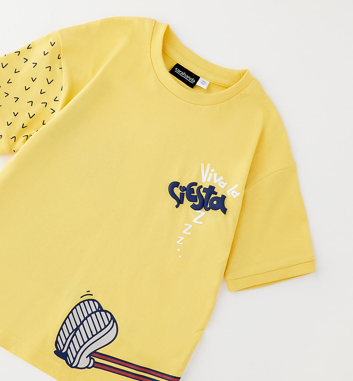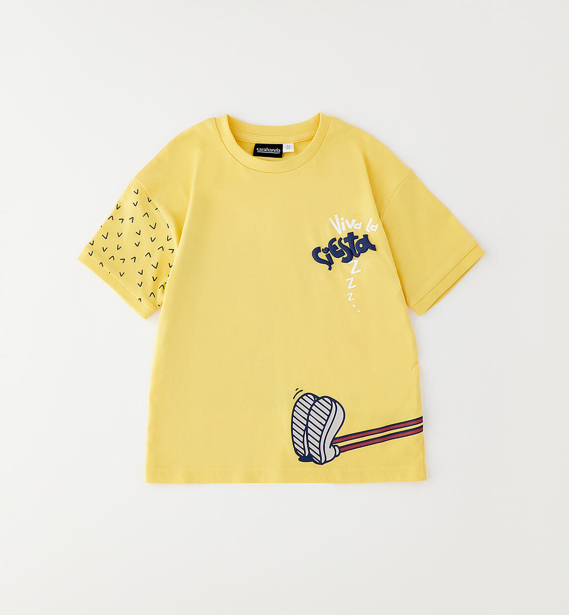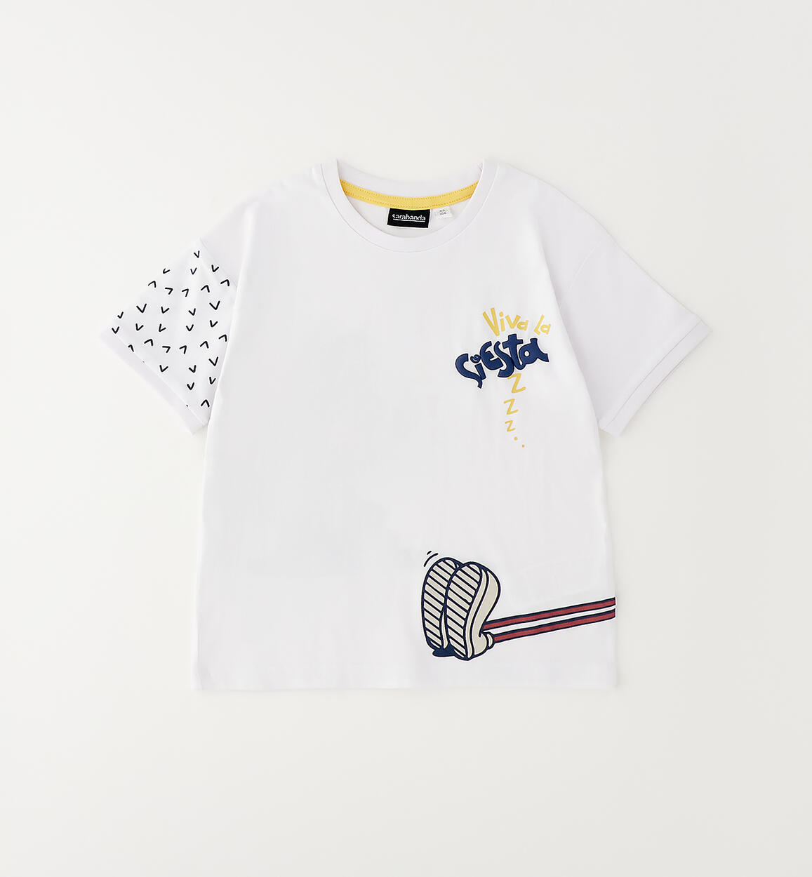 T-shirt per bambino Sarabanda realizzata in jersey 100% cotone con stampa dai dettagli a rilievo. Grande stampa dietro. Spalla calata, vestibilità over