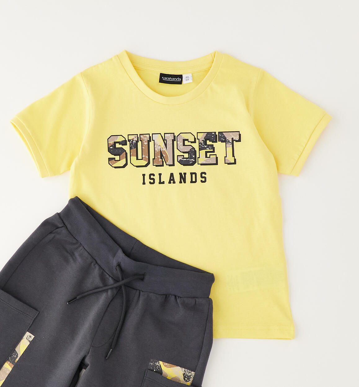 Completo a manica corta per bambino Sarabanda realizzato in 100% cotone. T-shirt gialla in jersey con stampa davanti. Short in felpa con elastico in vita e coulisse. Lunghezza al ginocchio. Tasche laterali con dettagli stampa camouflage
