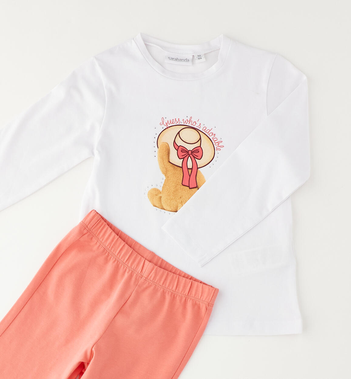 Completo per bambina Sarabanda realizzato in jersey stretch di cotone. Maglietta a manica lunga con stampa. Leggings con elastico in vita e fondo gamba più largo