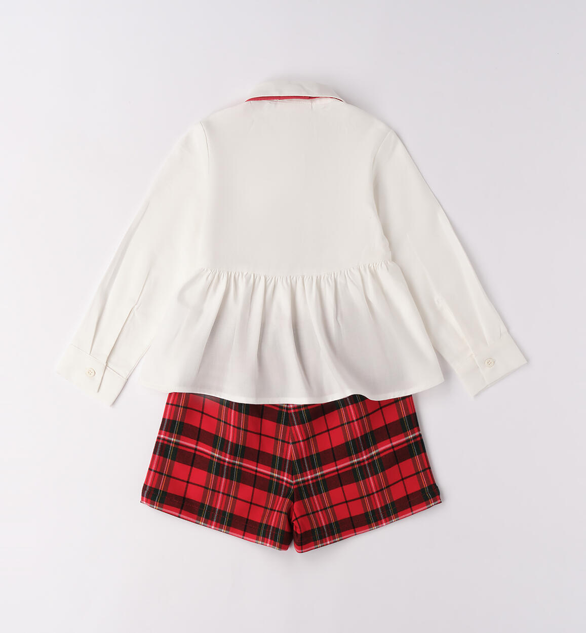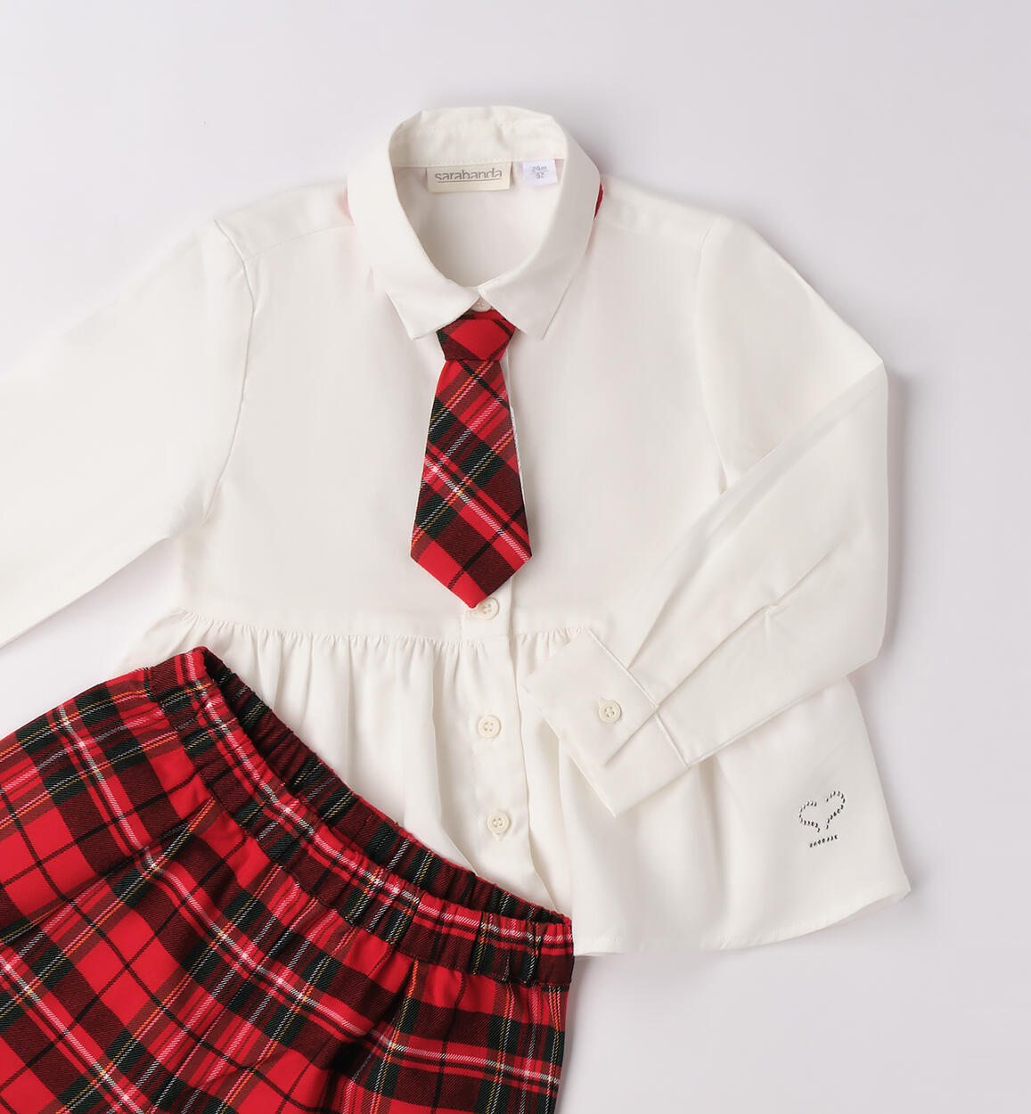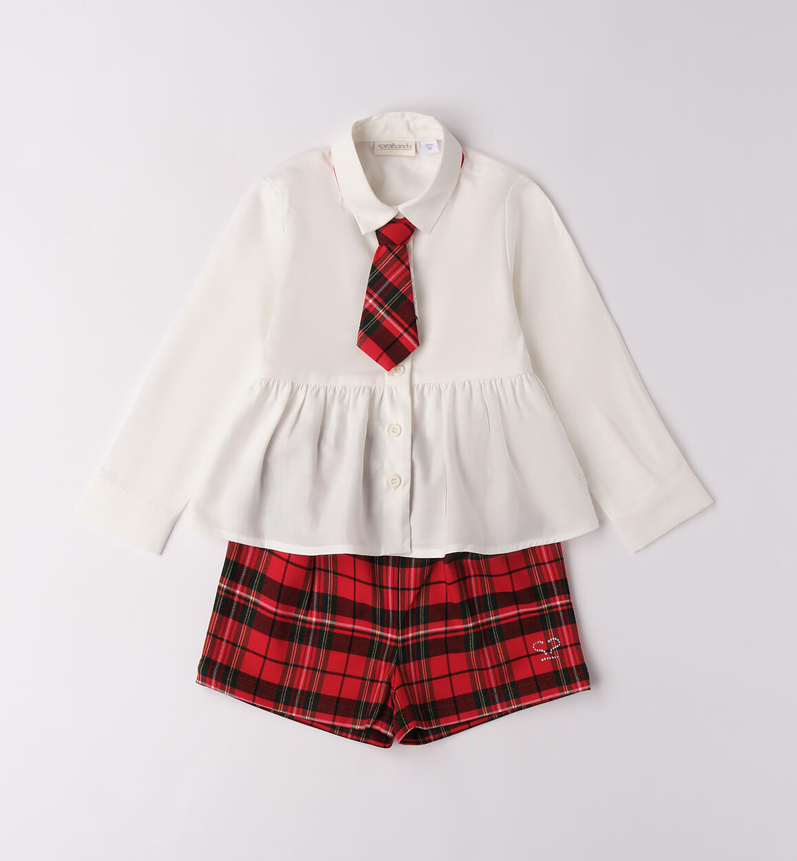 Completo per bambina Sarabanda 9 mesi - 8 anni. Il modello è composto da camicia e pantaloncino corto. La camicia è in twill 100% cotone con apertura tramite bottoni e cravatta in abbinamento. Il pantaloncino corto è in twill manopesca con elastico in vitaComposizione