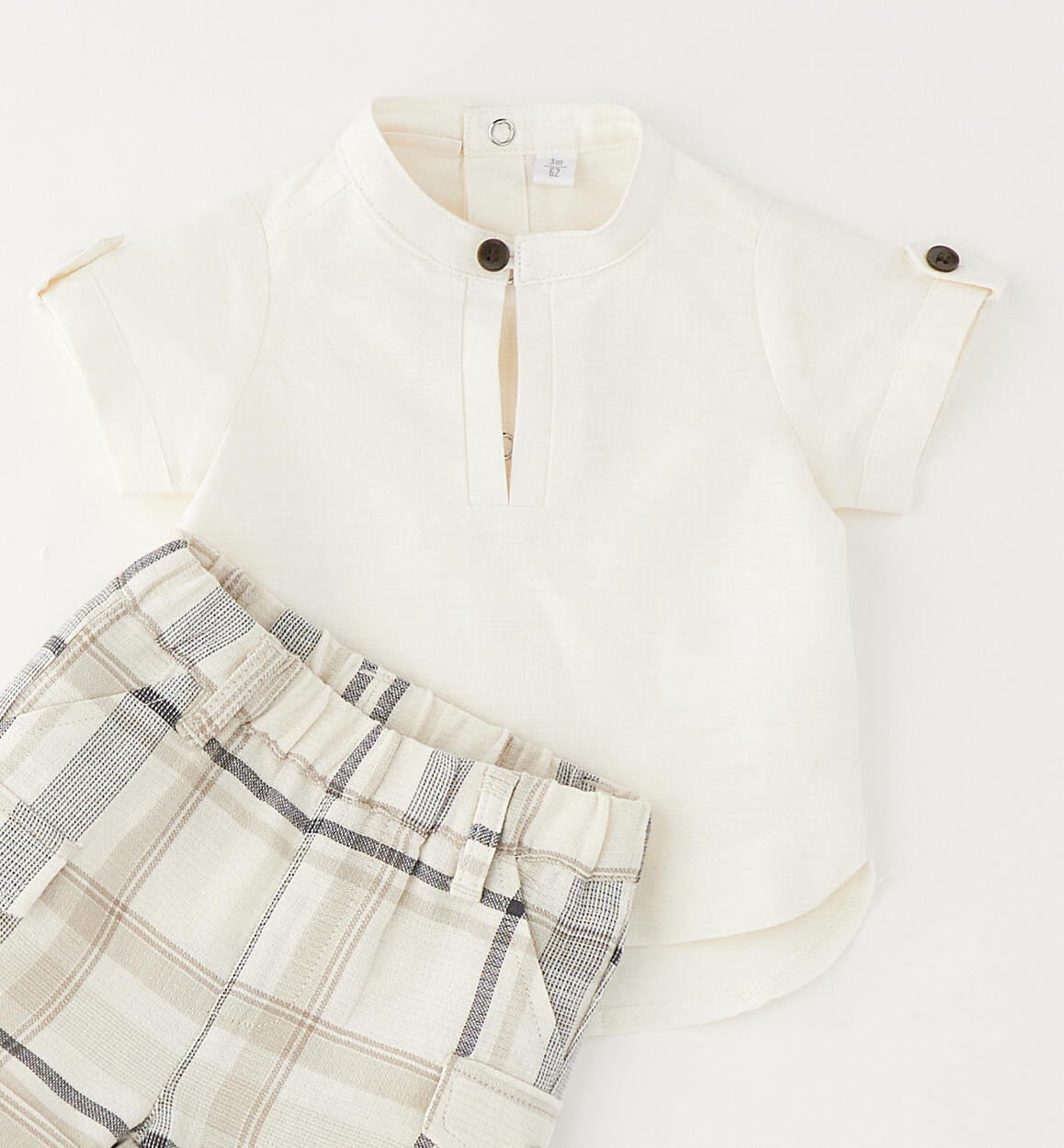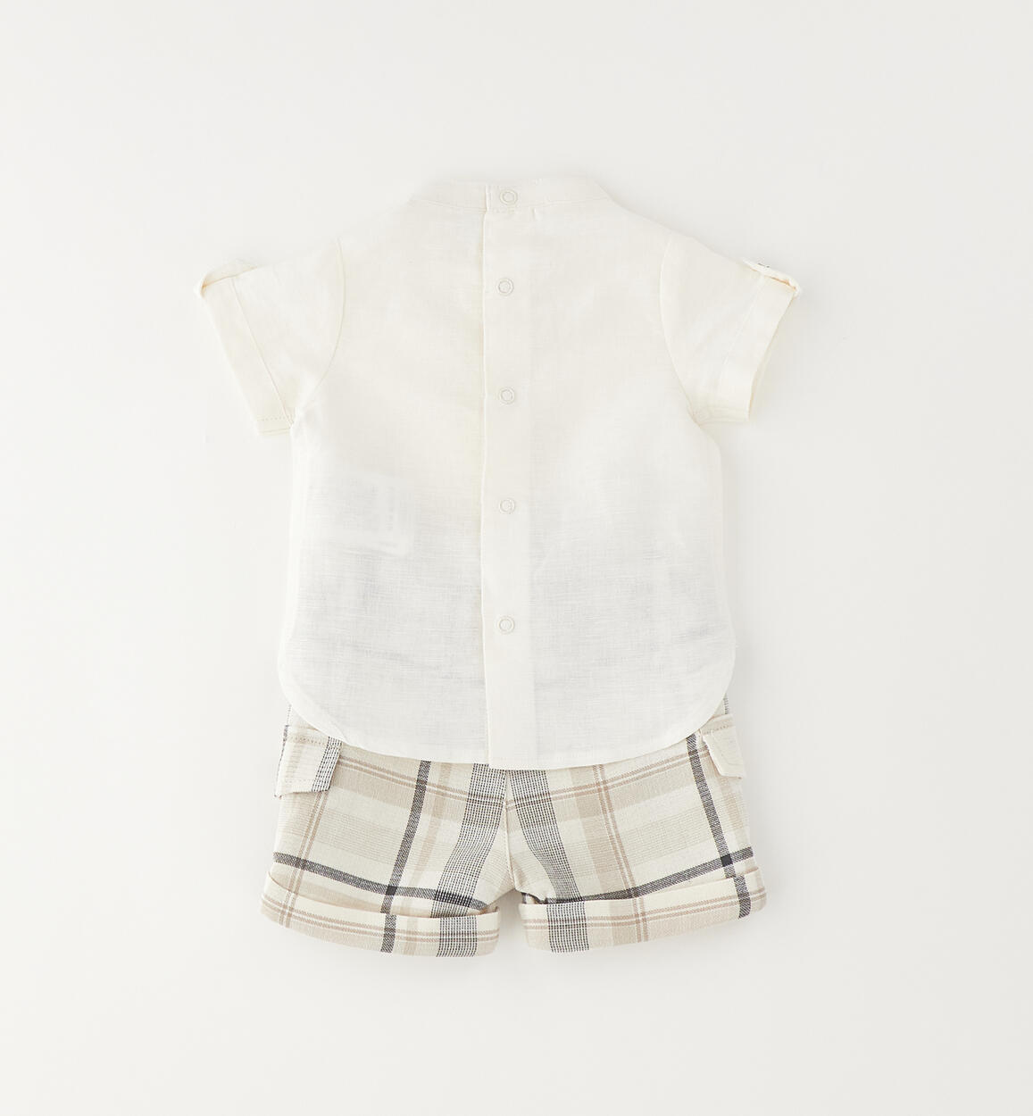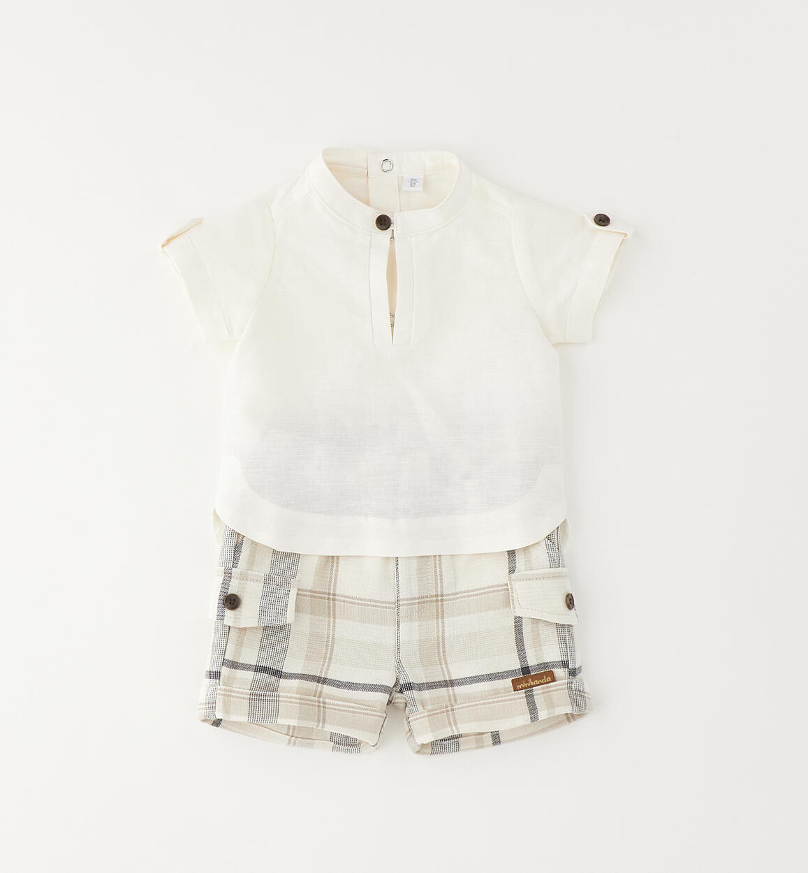 Completo estivo per neonato Minibanda composto da maglietta e pantaloncino. La maglietta è realizzata in lino e cotone. Modello svasato con la parte dietro più lunga, colletto alla coreana. Apertura dietro con bottoni. Il pantaloncino, fantasia check, ha i tasconi laterali ed è realizzato in 100% cotone con finte tasche