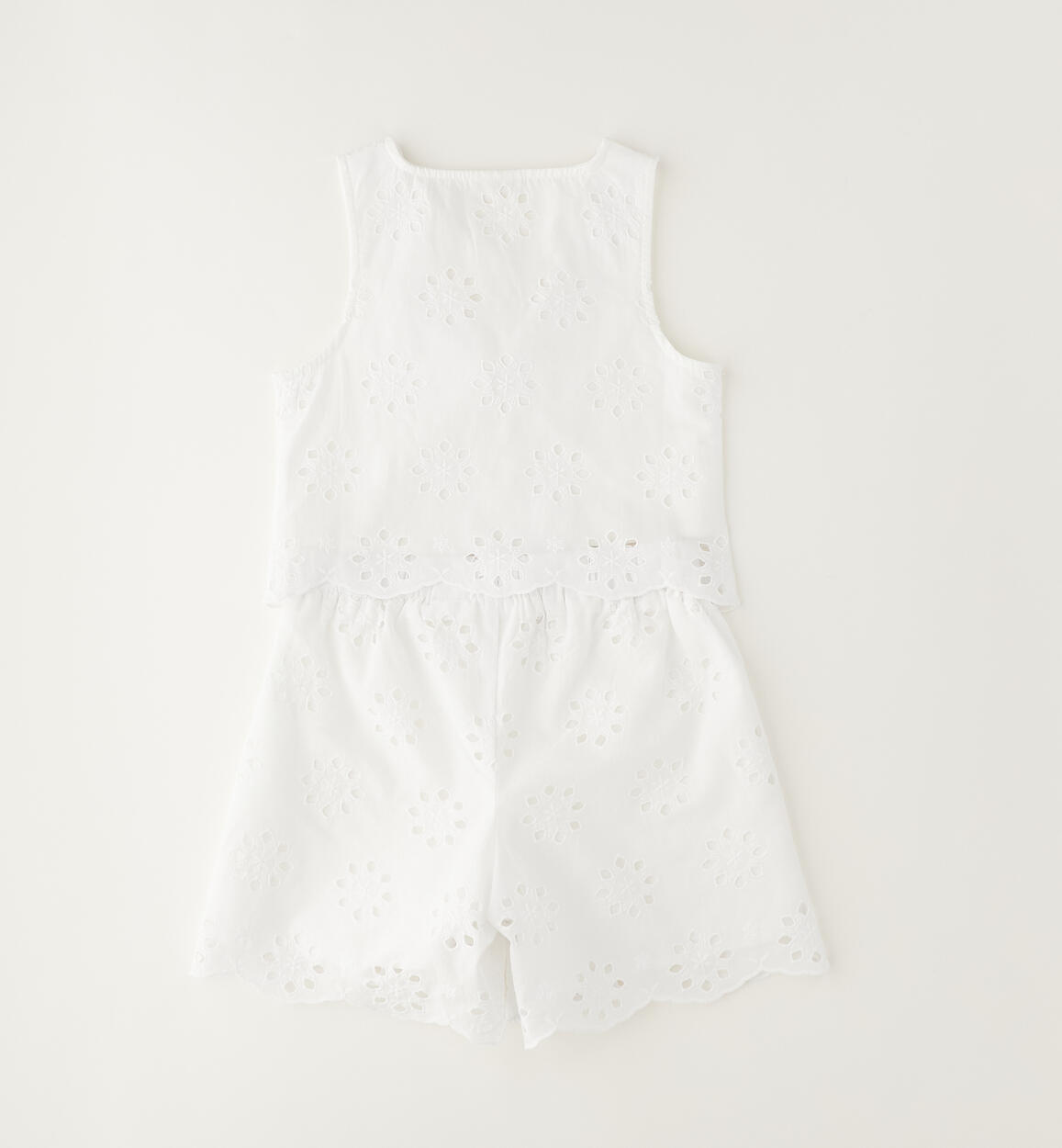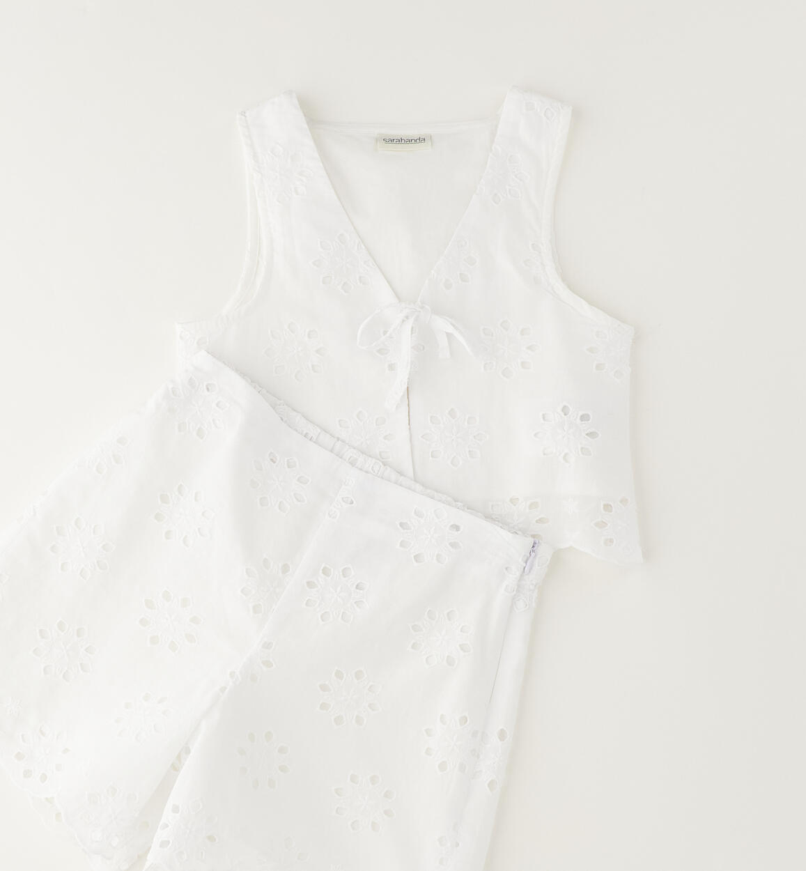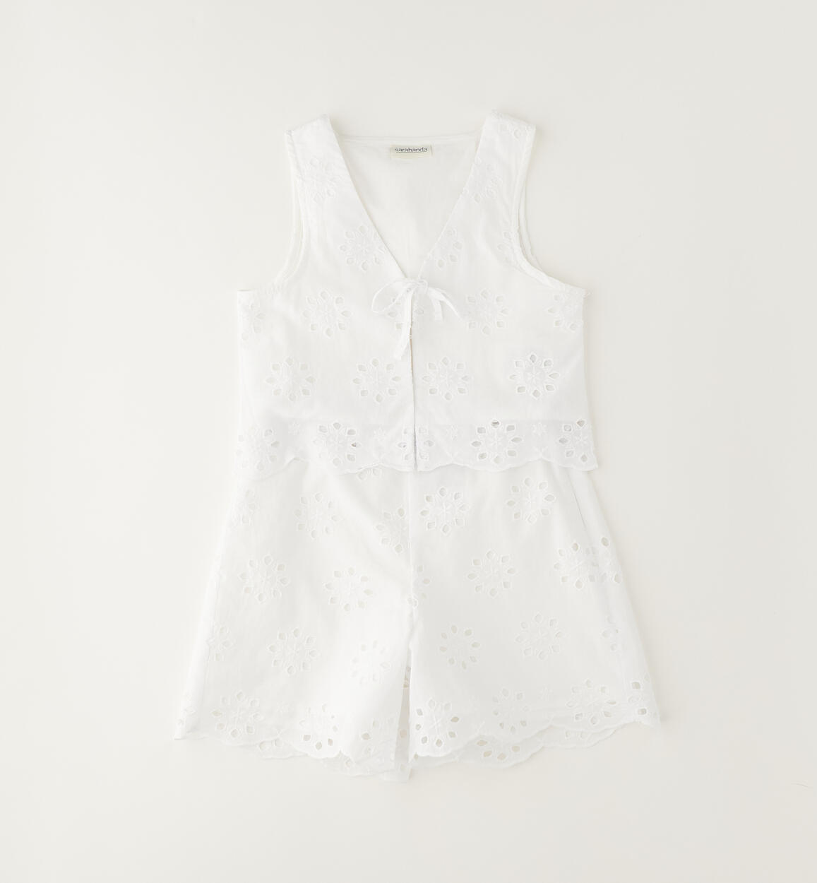 Completo estivo per ragazza Sarabanda realizzato in sangallo 100% cotone con fodera interna. Completo composto da gilet e shorts