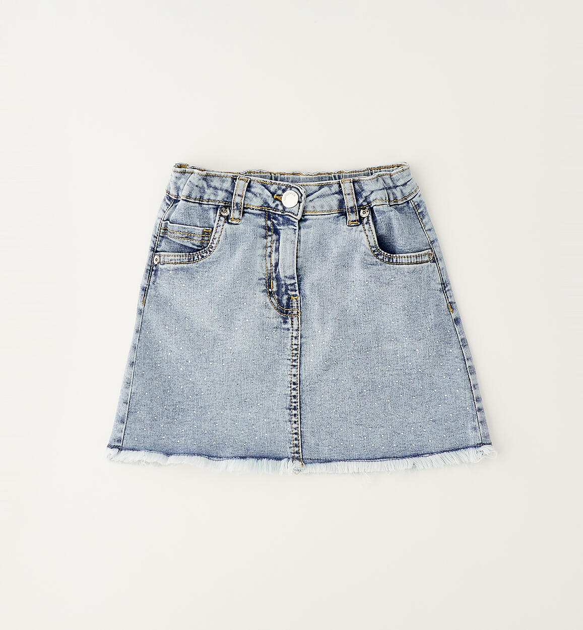 Gonna in denim superstretch di cotone per ragazza Sarabanda realizzata con sfrangiatura sul fondo. Modello illuminato da strass con apertura tramite zip e bottone. Lunghezza mini. Vita regolabile con elastico asolato interno