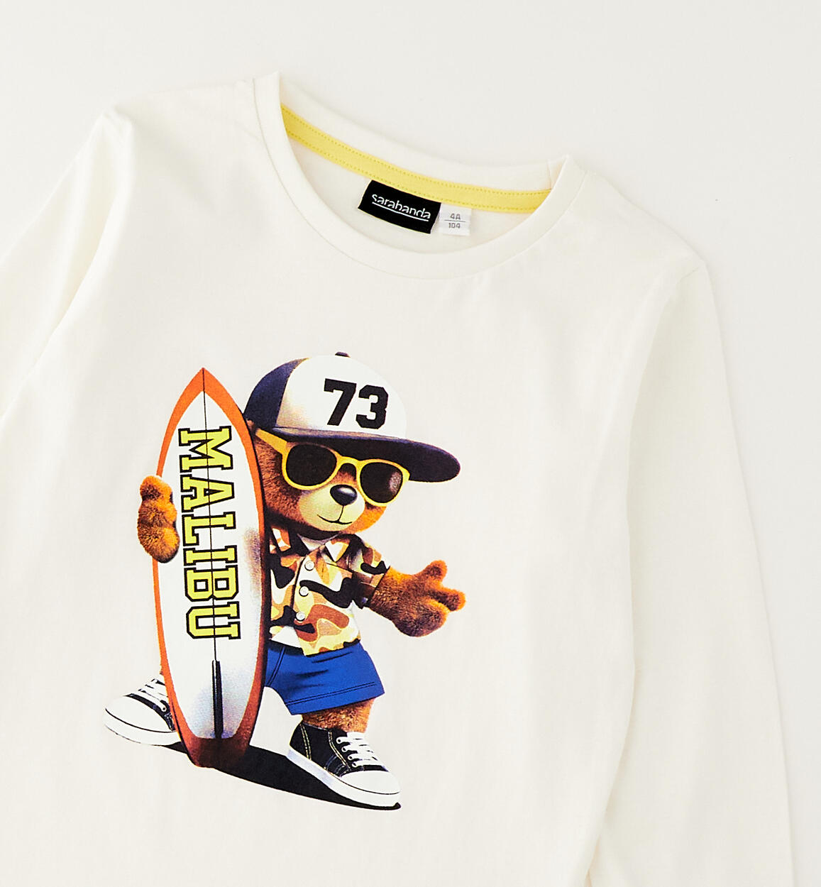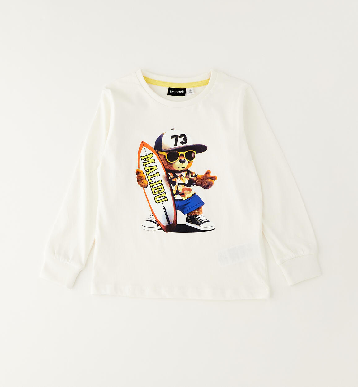 Girocollo a manica lunga per bambino Sarabanda realizzata in jersey 100% cotone con simpatica stampa davanti. Polsino sul fondo manica