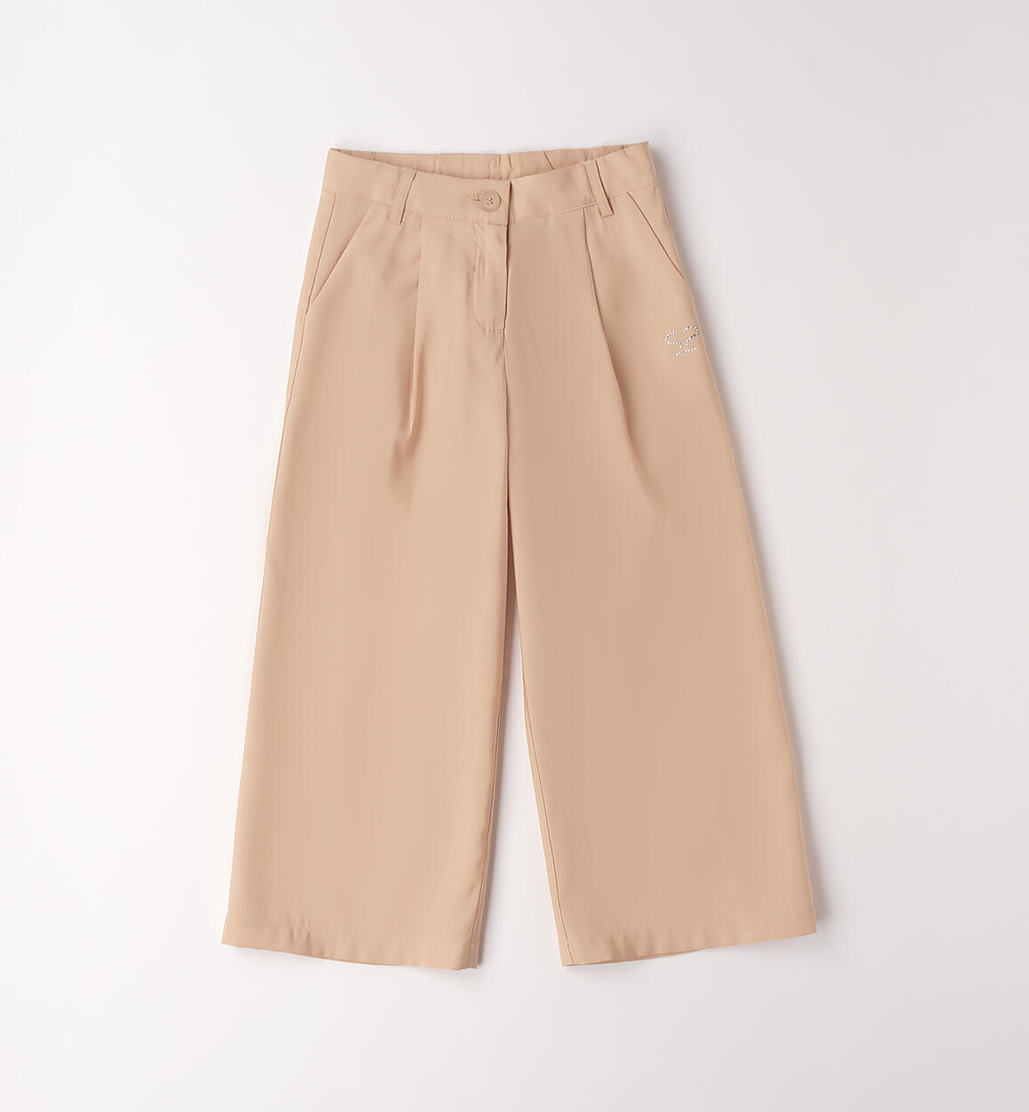 Pantalone lungo per bambina Sarabanda realizzato in taffeta con logo di strass. Modello ampio con apertura tramite zip e bottone. Vita regolabile con elastico asolato interno