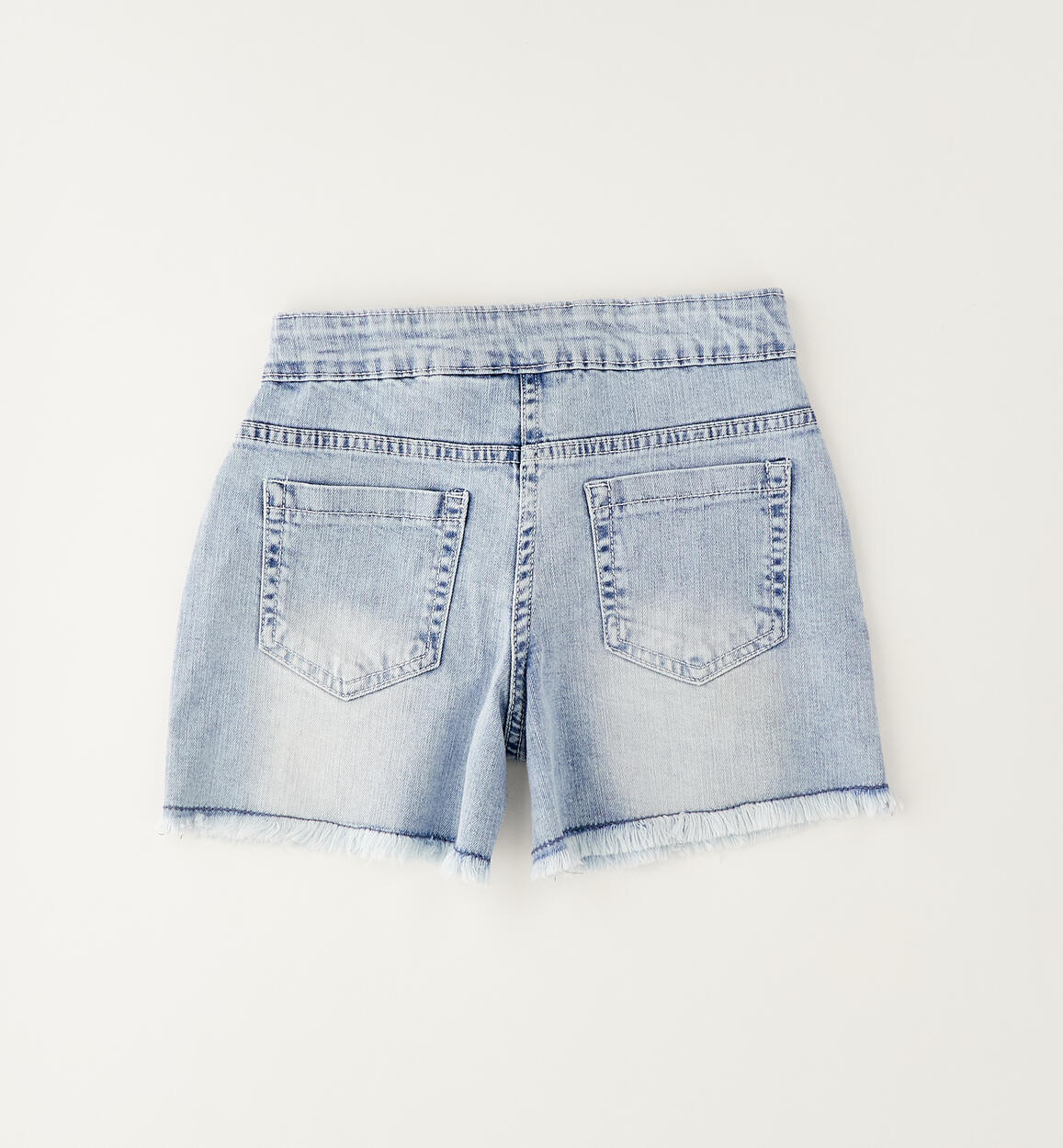 Pantalone corto in denim stretch di cotone per ragazza Sarabanda con sfrangiatura sul fondo gamba. Apertura con zip e bottoni. Vita regolabile con elastico asolato interno