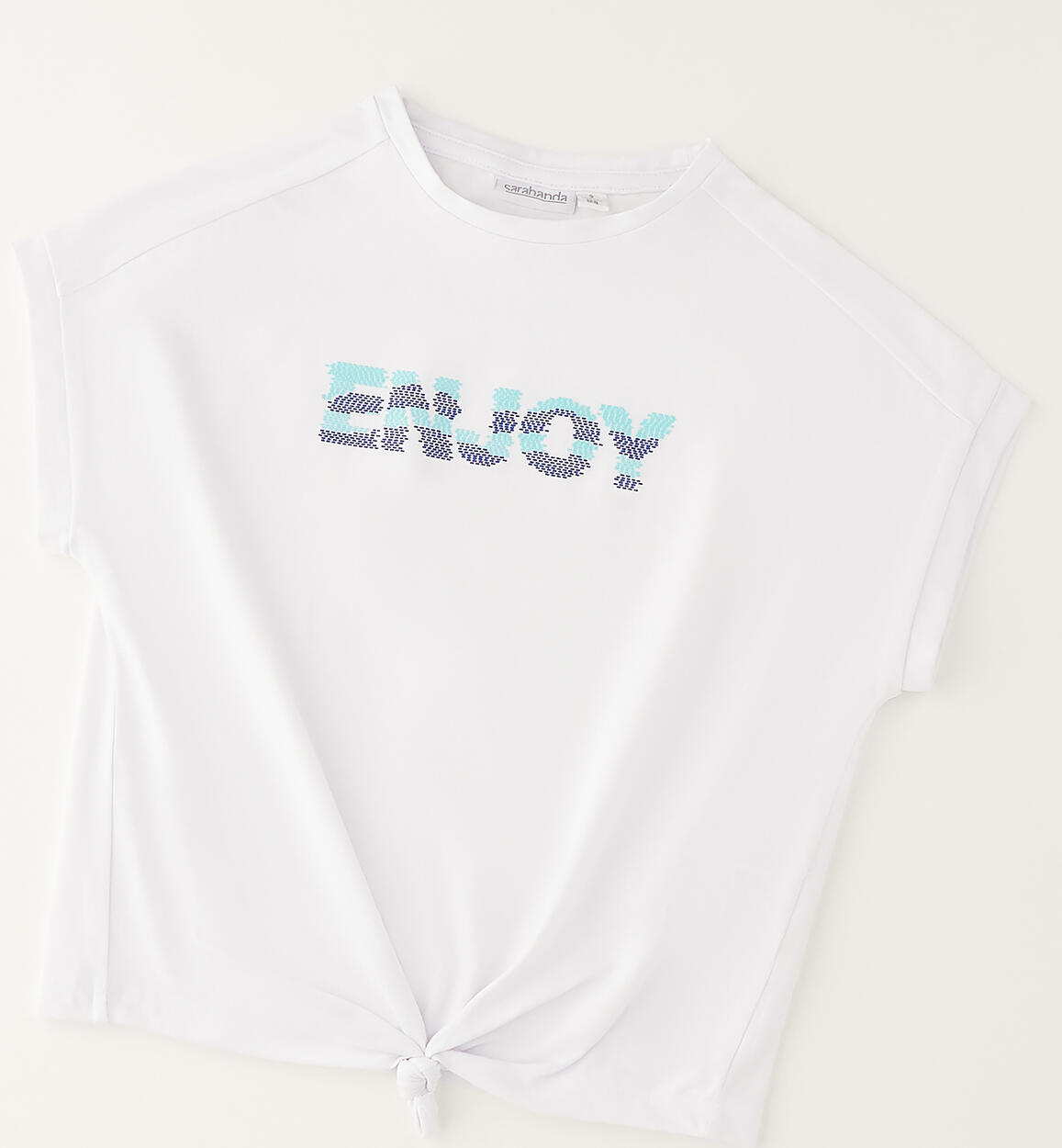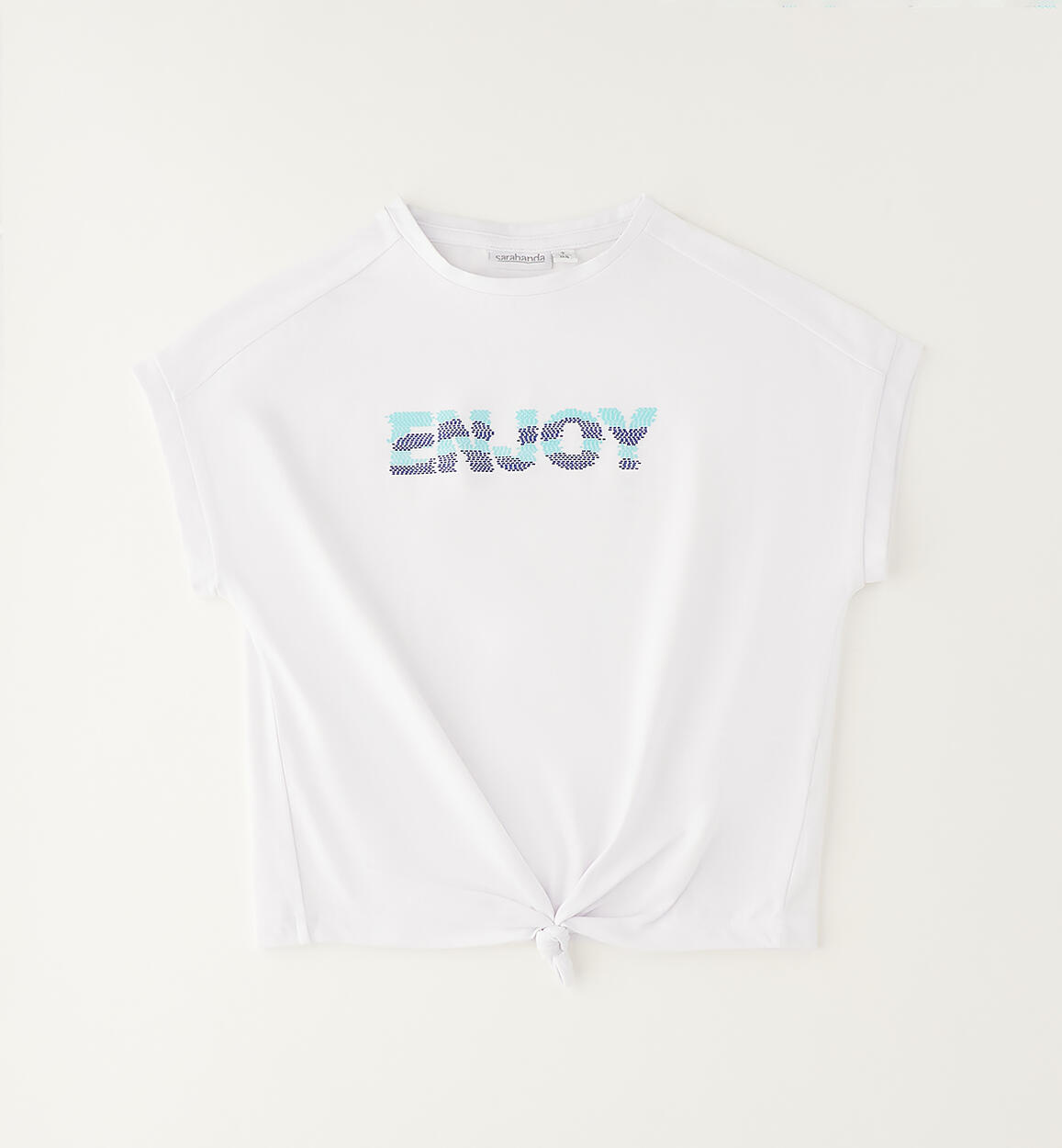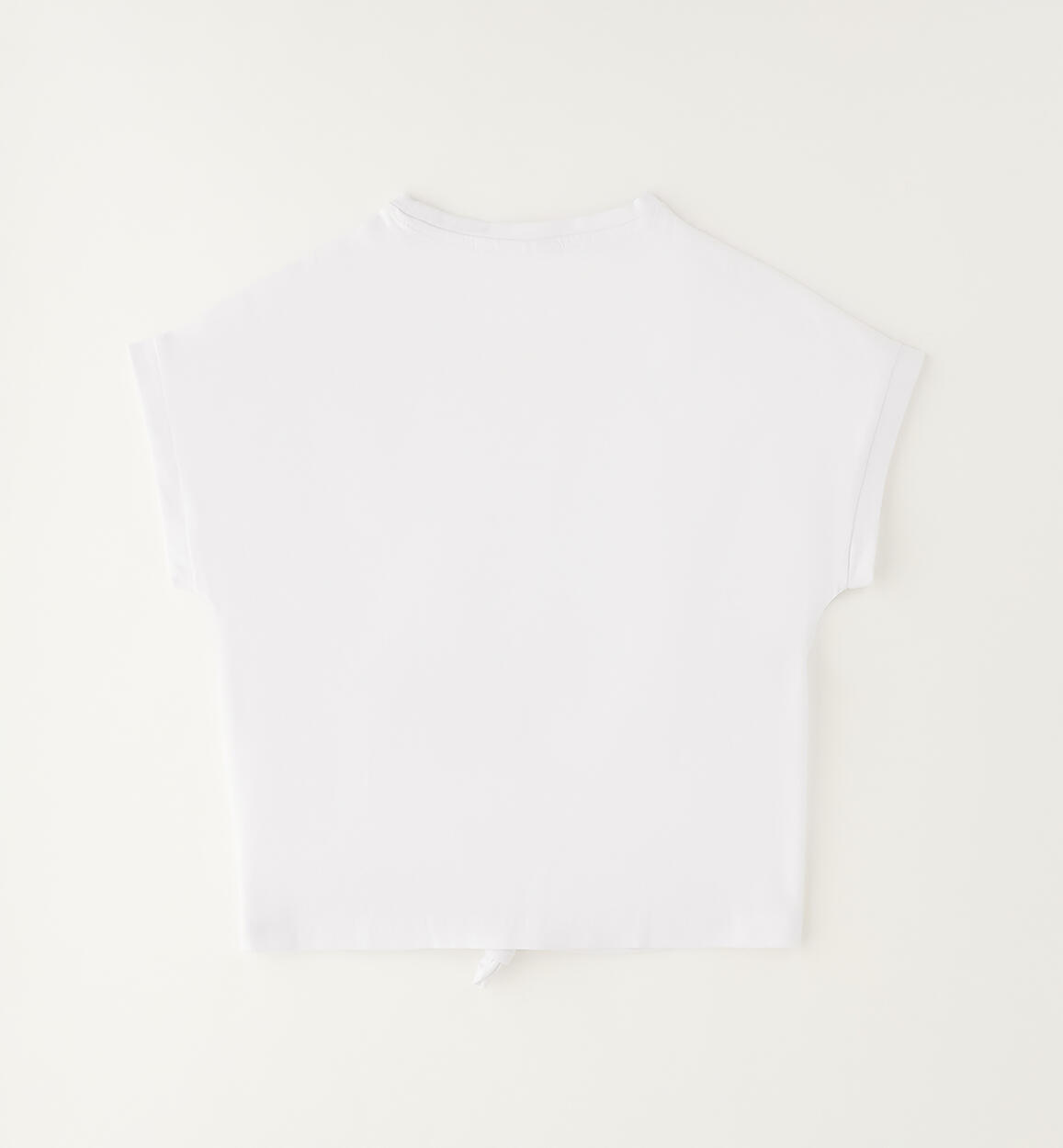 T-shirt per ragazza Sarabanda realizzata in jersey stretch di cotone con stampa a rilievo e nodo davanti
