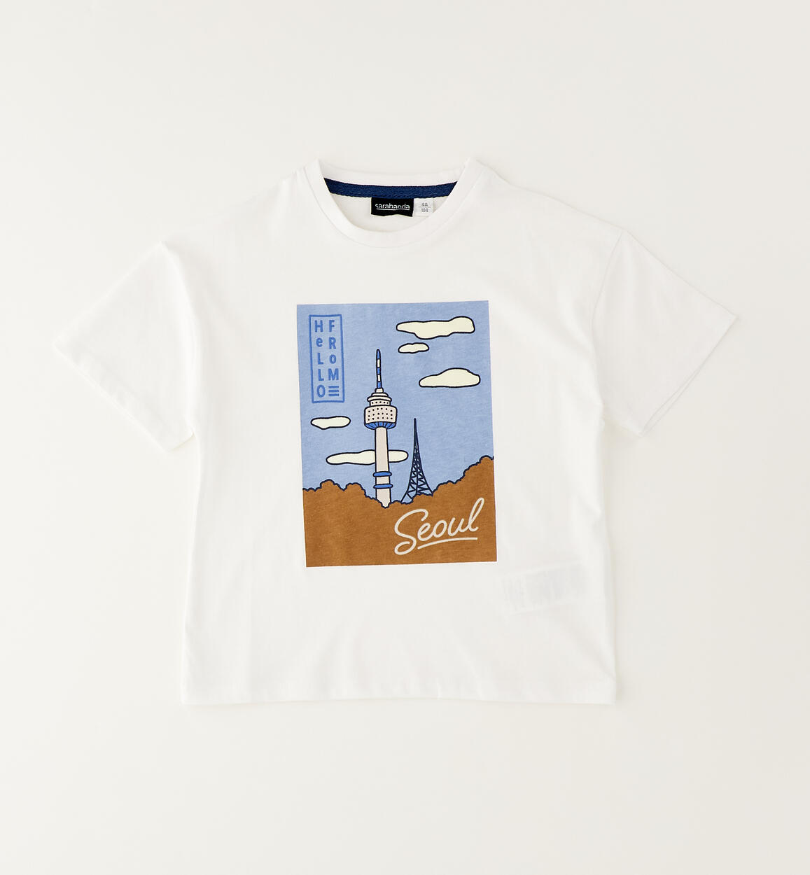 T-shirt per bambino Sarabanda realizzata in jersey 100% cotone con stampa davanti e dettagli a rilievo. Spalla calata e vestibilità over