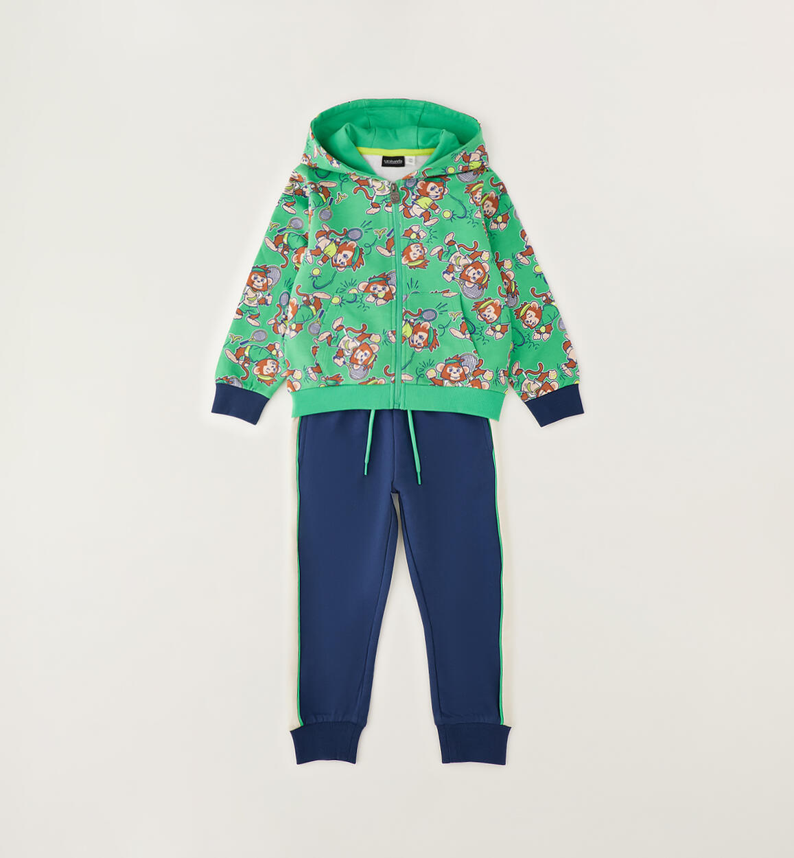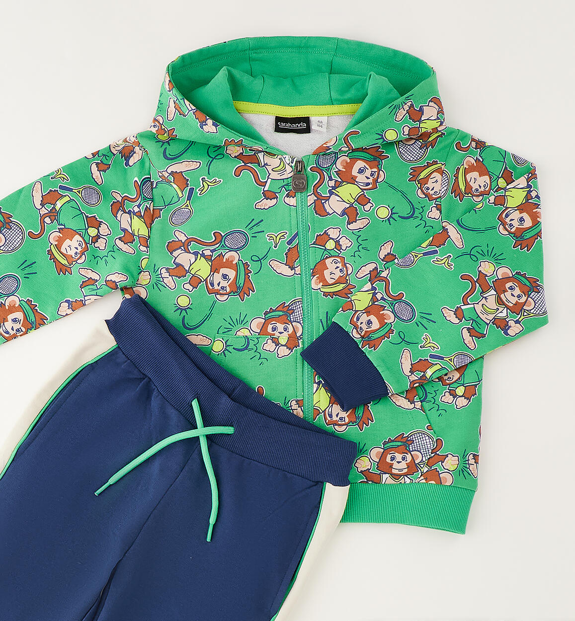 Tuta jogging due pezzi per bambino Sarabanda realizzata in felpa 100% cotone. Giacchetto con cappuccio, apertura con zip, tasca a marsupio e stampa all over di simpatiche scimmie. Pantalone con elastico in vita e coulisse, banda laterale e polsino sul fondo gamba. Vestibilità regular