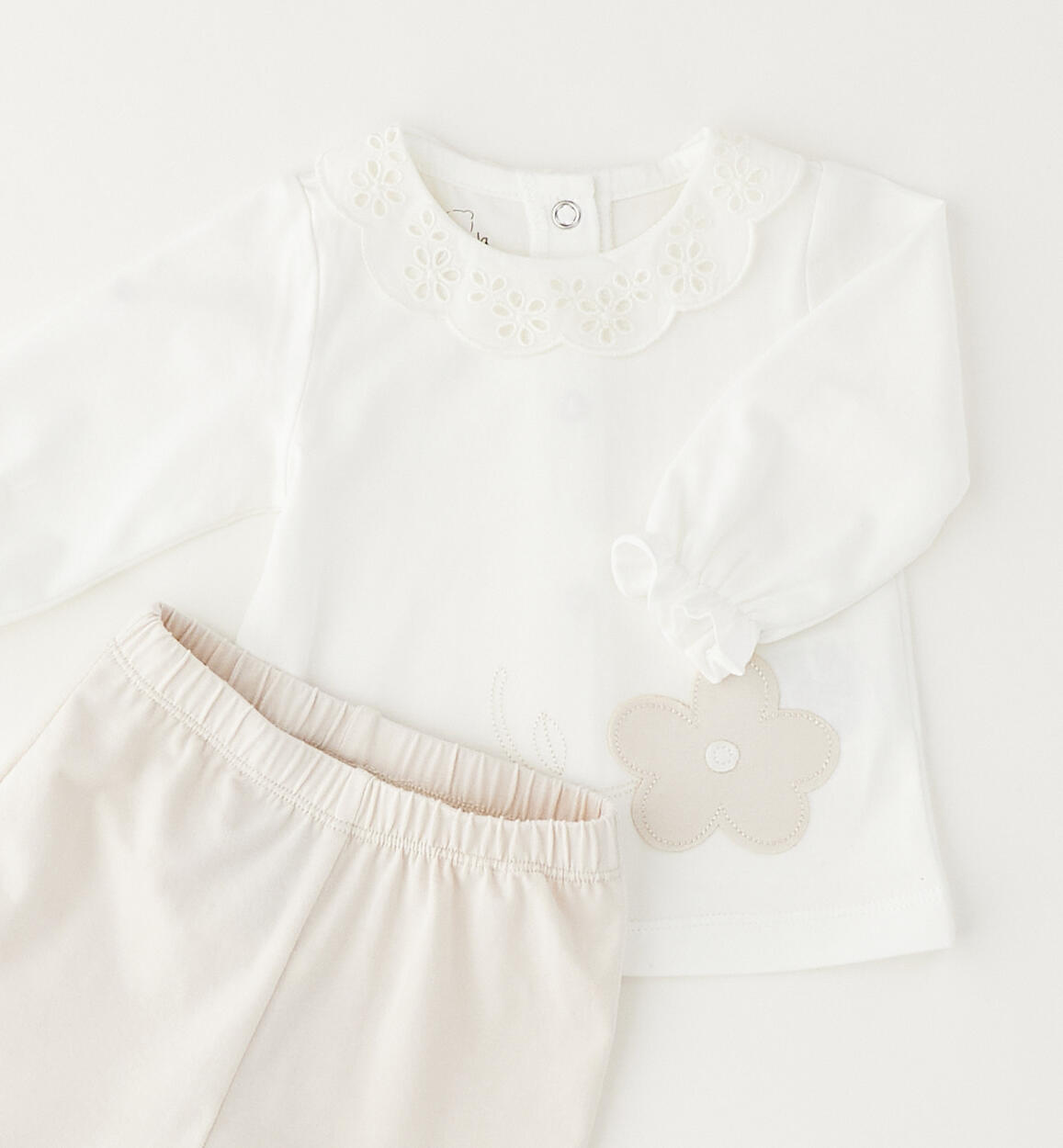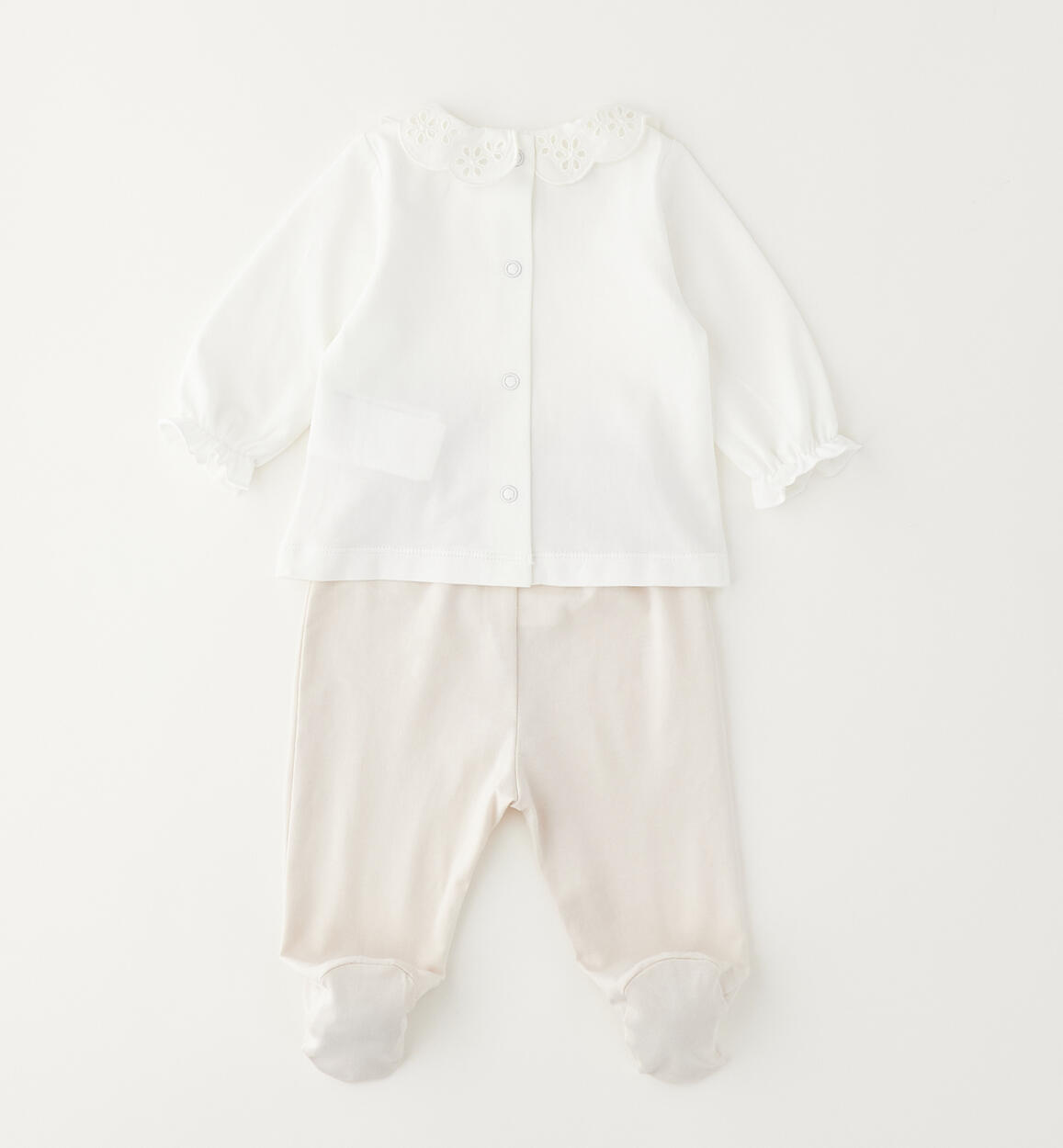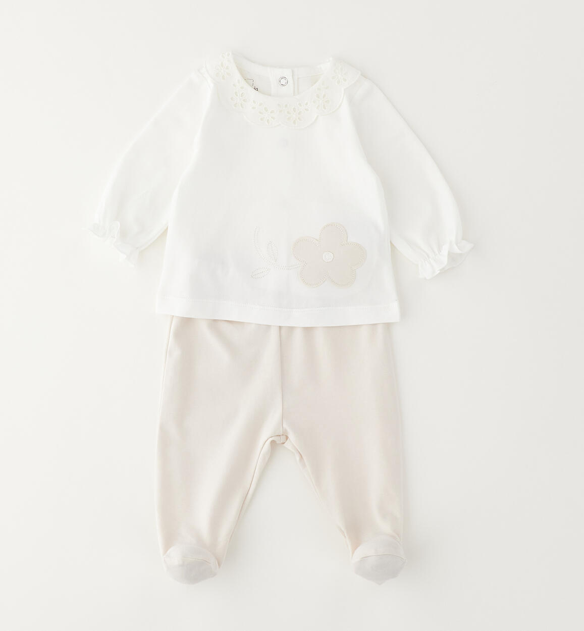 Tutina due pezzi con piede per neonata Minibanda realizzata in jersey stretch di cotone. La maglietta ha l'apertura dietro con bottoni a pressione, colletto in San Gallo e applicazione ricamo. Elastico arricciato sul fondo manica. Scegliendo i nostri prodotti in cotone, sostieni l'impegno di Minibanda nella missione Better Cotton. La fornitura di questo prodotto avviene tramite un sistema di bilancio di massa e potrebbe non contenere Better Cotton. Leggi di più su bettercotton.org/massbalance