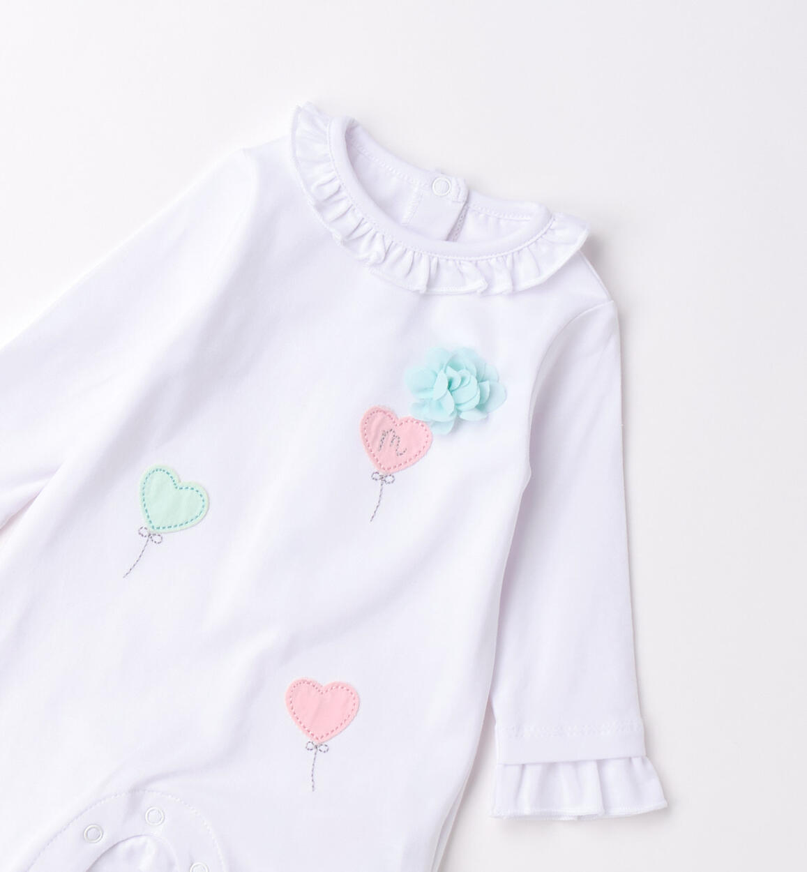 Tutina intera con piede per neonata Minibanda realizzata in jerset stretch di cotone con apertura sul retro e nel sottogamba con bottoni a pressione per agevolare il cambio e la vestizione. La tutina è arricchita da ruches, ricami e applicazioni ricamo. Scegliendo i nostri prodotti in cotone, sostieni l'impegno di Minibanda nella missione Better Cotton. La fornitura di questo prodotto avviene tramite un sistema di bilancio di massa e potrebbe non contenere Better Cotton. Leggi di più su bettercotton.org/massbalance