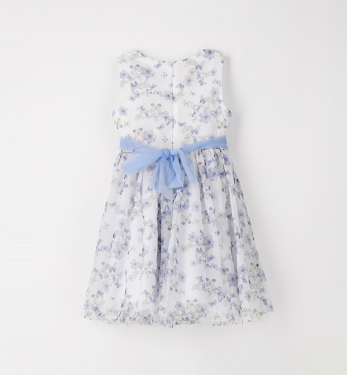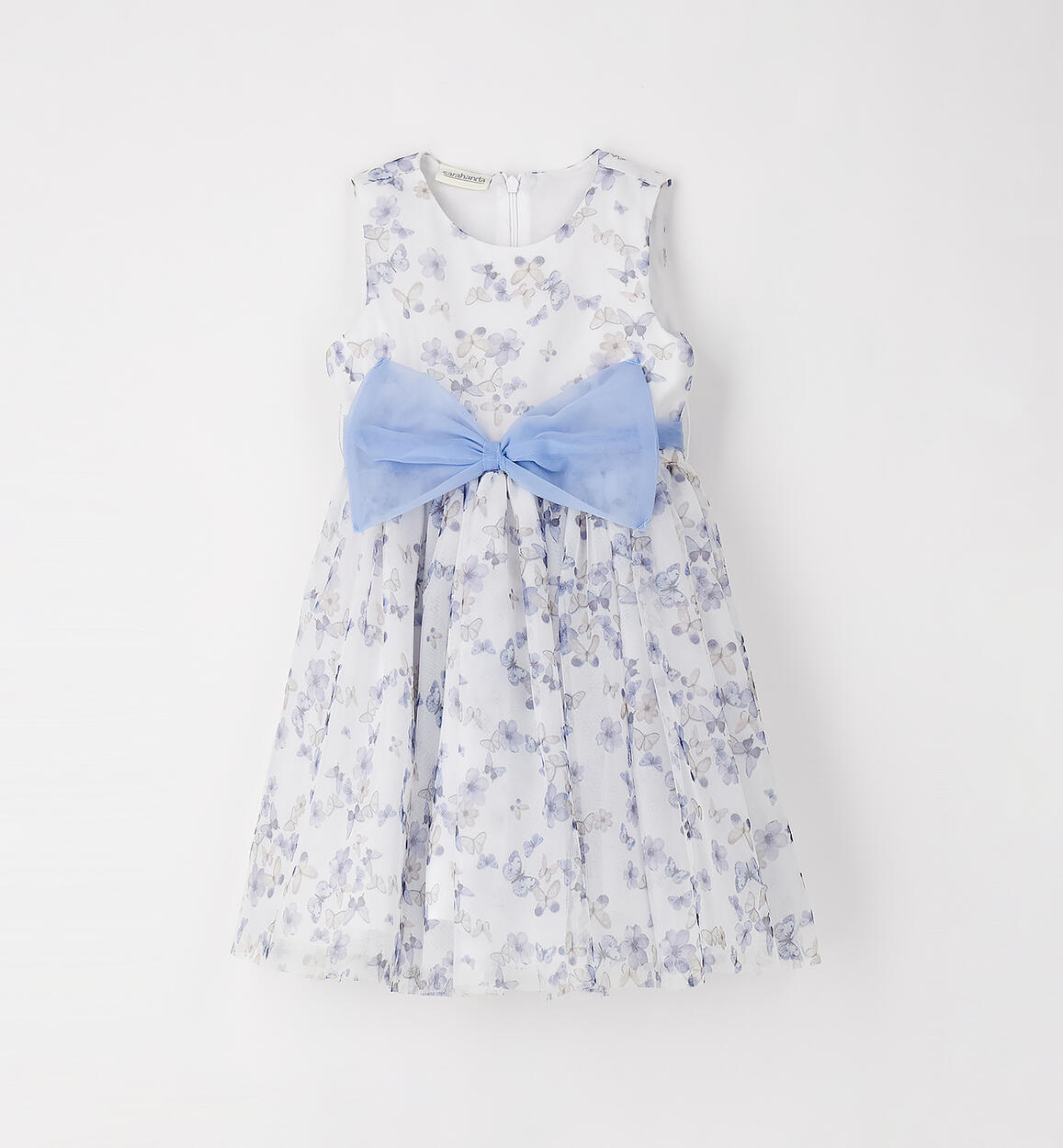 Abito smanicato per bambina Sarabanda realizzato in tulle con fanntasia all over e fodera in cotone. Apertura dietro con zip invisibile. Lunghezza al ginocchio. Cintura in vita con fiocco realizzata in tulle