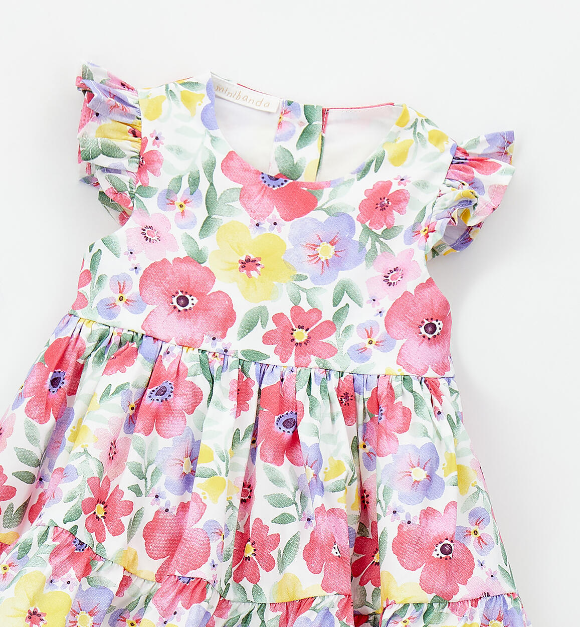 Abito smanicato per neonata Minibanda realizzato in popeline stretch di cotone con fodera in cotone. Fantasia floreale con apertura dietro tramite bottoni. Lunghezza sopra al ginocchio. Scegliendo i nostri prodotti in cotone, sostieni l'impegno di Minibanda nella missione Better Cotton. La fornitura di questo prodotto avviene tramite un sistema di bilancio di massa e potrebbe non contenere Better Cotton. Leggi di più su bettercotton.org/massbalance